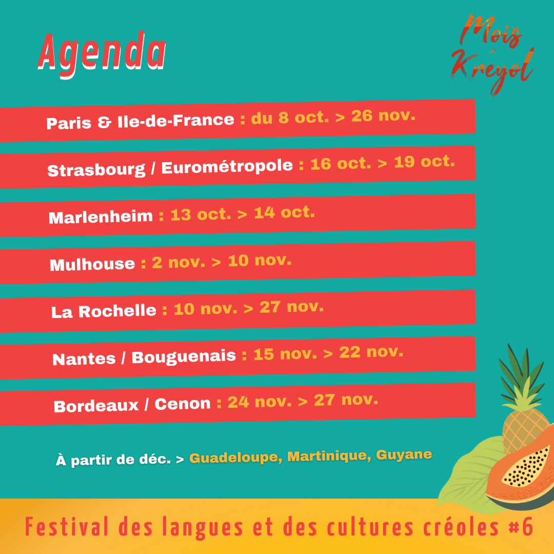 Une programmation éclectique et itinérante puisque cette édition 2022 du "Mois Kréyol", comme la précédente, fera escale à Paris, en Ile-de-France, à Nantes, Strasbourg, Mulhouse, Bordeaux, et nouveauté cette année la Rochelle et se poursuivra à partir de décembre 2022 en Martinique, Guadeloupe et Guyane.