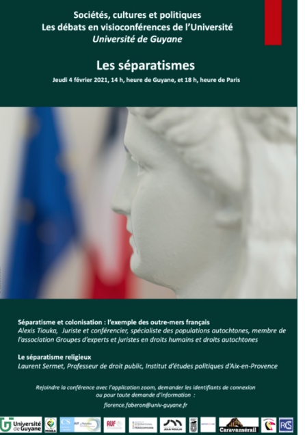 Le cycle de conférences Sociétés, cultures et politiques porté par l’Université de Guyane, le DFR Sciences juridiques et économiques et le laboratoire Migrations, interculturalités et éducation en Amazonie se poursuit tout au long de l’année 2021 et vous propose le 4 février 2021, à 14 h, heure de Guyane, et 18 h, heure de Paris, une conférence sur « Les séparatismes ». Alexis Tiouka, Juriste et conférencier, spécialiste des populations autochtones, membre de l’association Groupes d’experts et juristes en droits humains et droits autochtones, et Laurent Sermet, Professeur de droit public à l’Institut d’études politiques d’Aix-en-Provence, procèderont à l’examen de la question des séparatismes au regard de la colonisation d’une part et de la religion d’autre part. Ces deux communications permettront d’aborder de nombreux débats liés à la colonisation : l’idéalisation de la France, la situation de dépendance, la France enseignée aux colonies, les Français des colonies, les résistances et les bouleversements, le rôle de l’Église et de l’État… mais encore, alors que vient d’être déposé en décembre dernier un projet de loi confortant le respect des principes de la République, les laïcités et le vivre-ensemble, la liberté de religion et la liberté religieuse, les lois de 1901, 1905 et 1907 ou encore la formation des imams.