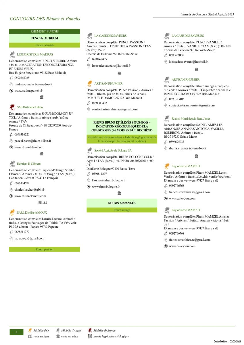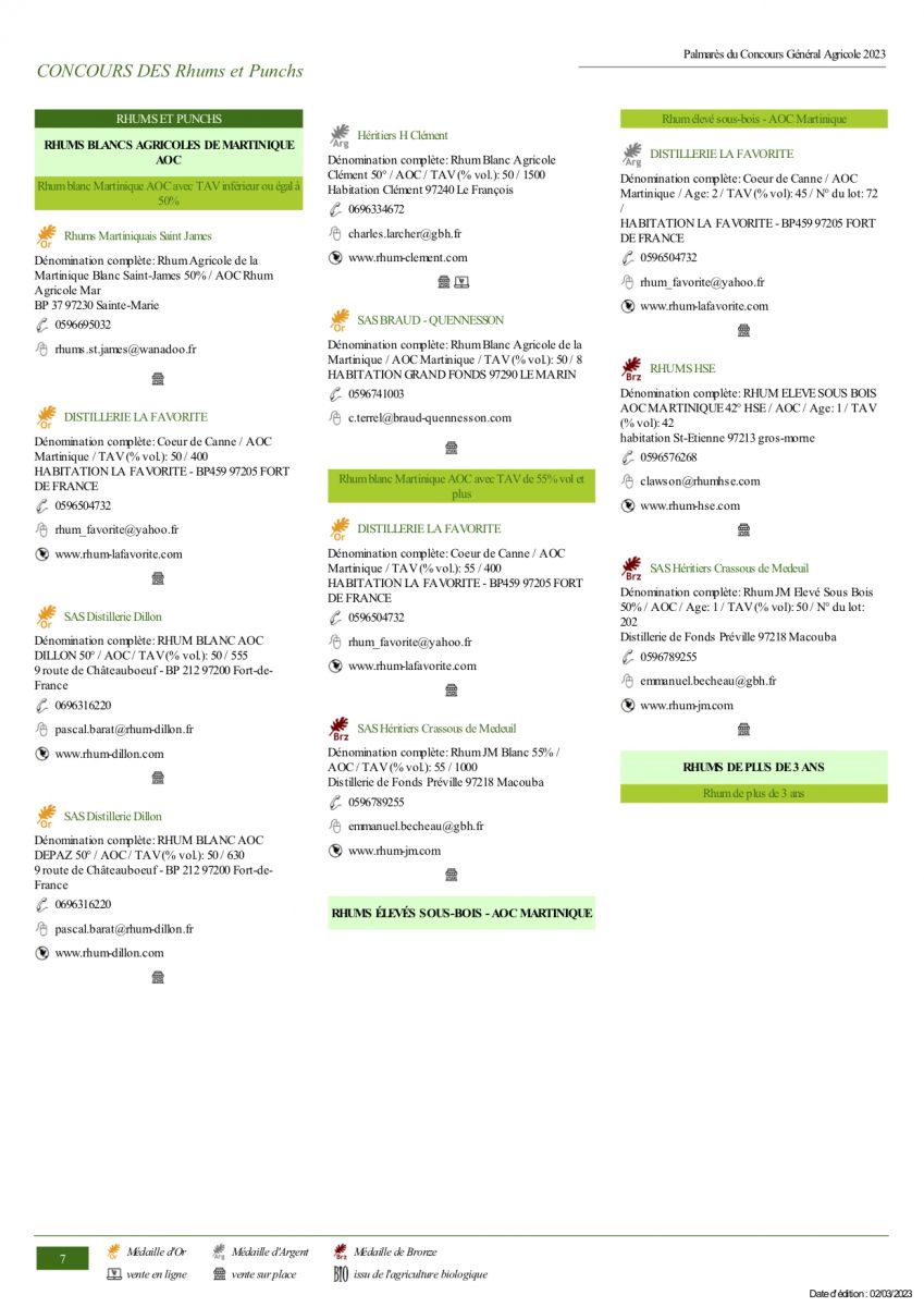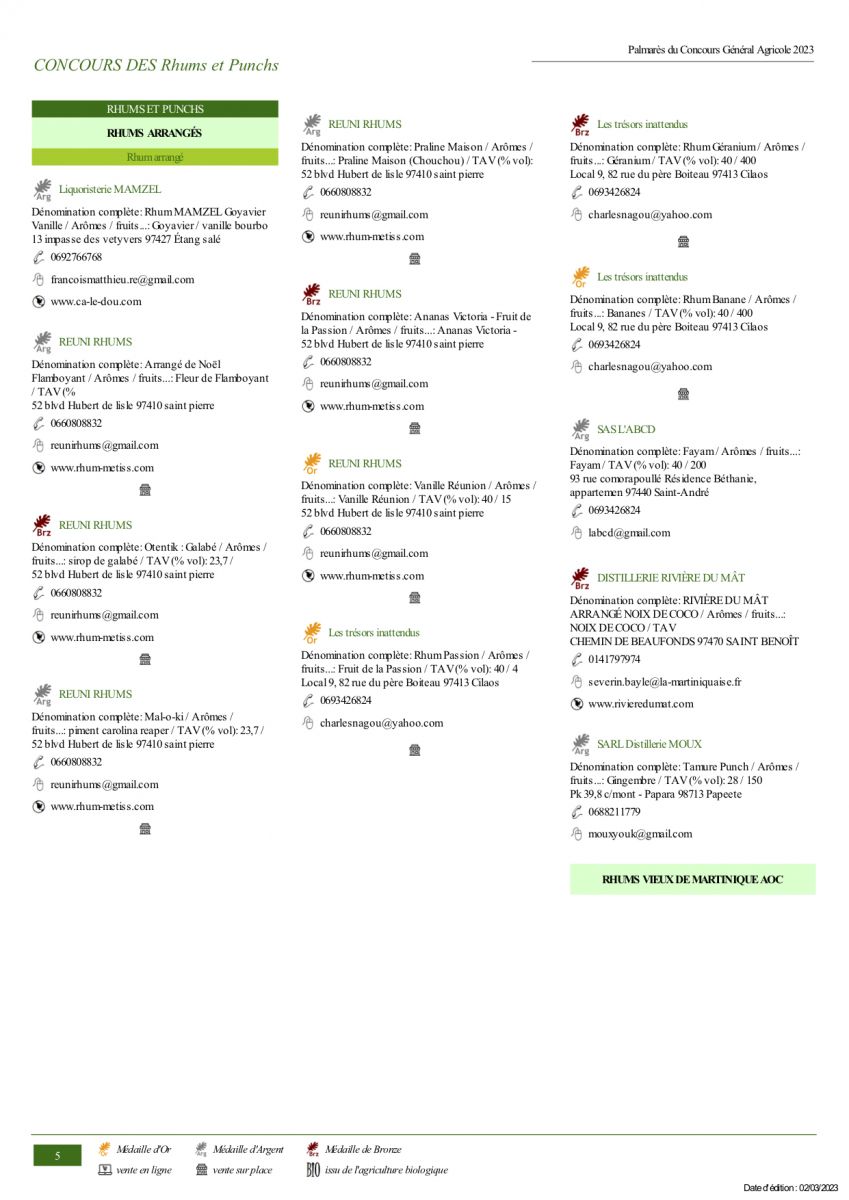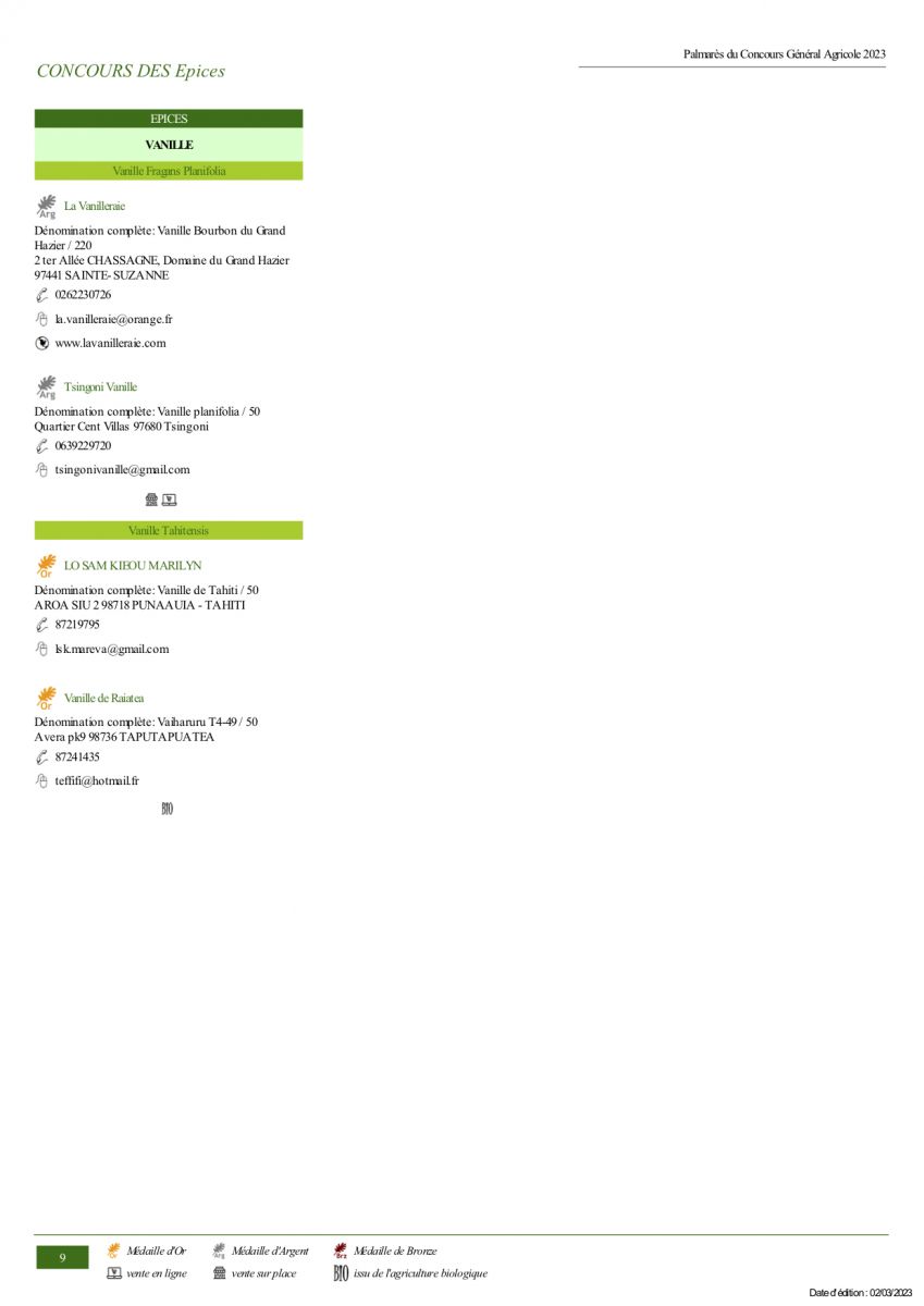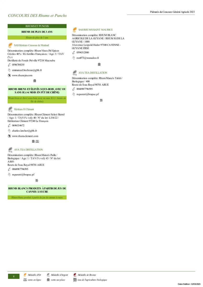 Parmi ces dernières : deux pour les confitures de La Réunion, deux pour les vanilles de Polynésie, trois pour les miels, dont un de La Réunion et un de Nouvelle-Calédonie, 31 pour les rhums et punch, dont huit de Guadeloupe, 17 de Martinique, quatre de La Réunion, un de Polynésie et un de Guyane). À noter également une médaille d’argent pour la vanille IGP de La Réunion et une médaille en argent pour la vanille de Mayotte, et une médaille d'argent en rhum pour la Polynésie.