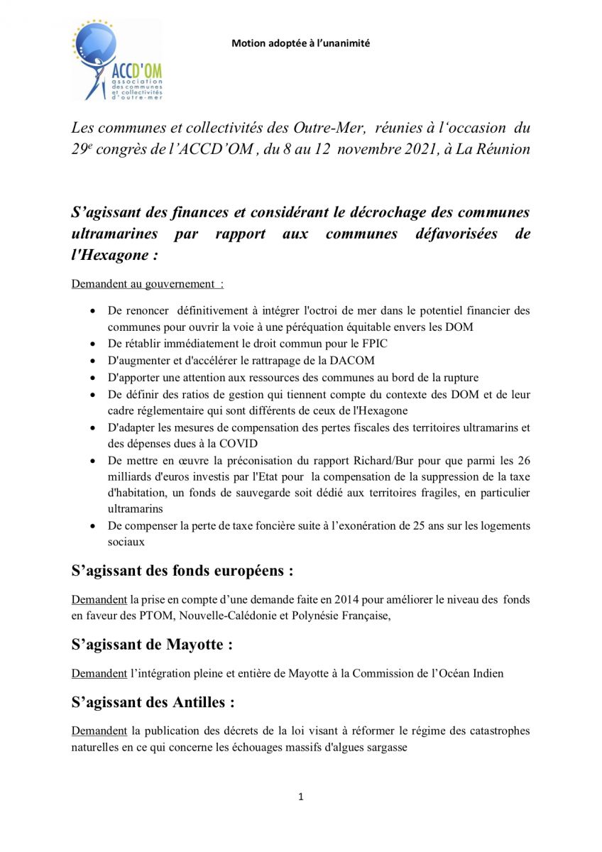 L’Association des Communes et Collectivités d’Outre-mer (ACCD’OM) et sa trésorière, également maire de Saint-Laurent du Maroni en Guyane, ont remis, lors de l’ouverture du Congrès des Maires, la motion adoptée lors de la dernière assemblée générale de l’organisation, qui a réuni plus de 180 élus locaux ultramarins du 8 au 12 novembre dernier à La Réunion. Le nouveau président de l’AMF, David Lisnard, se penchera avec le nouveau bureau sur cette motion.