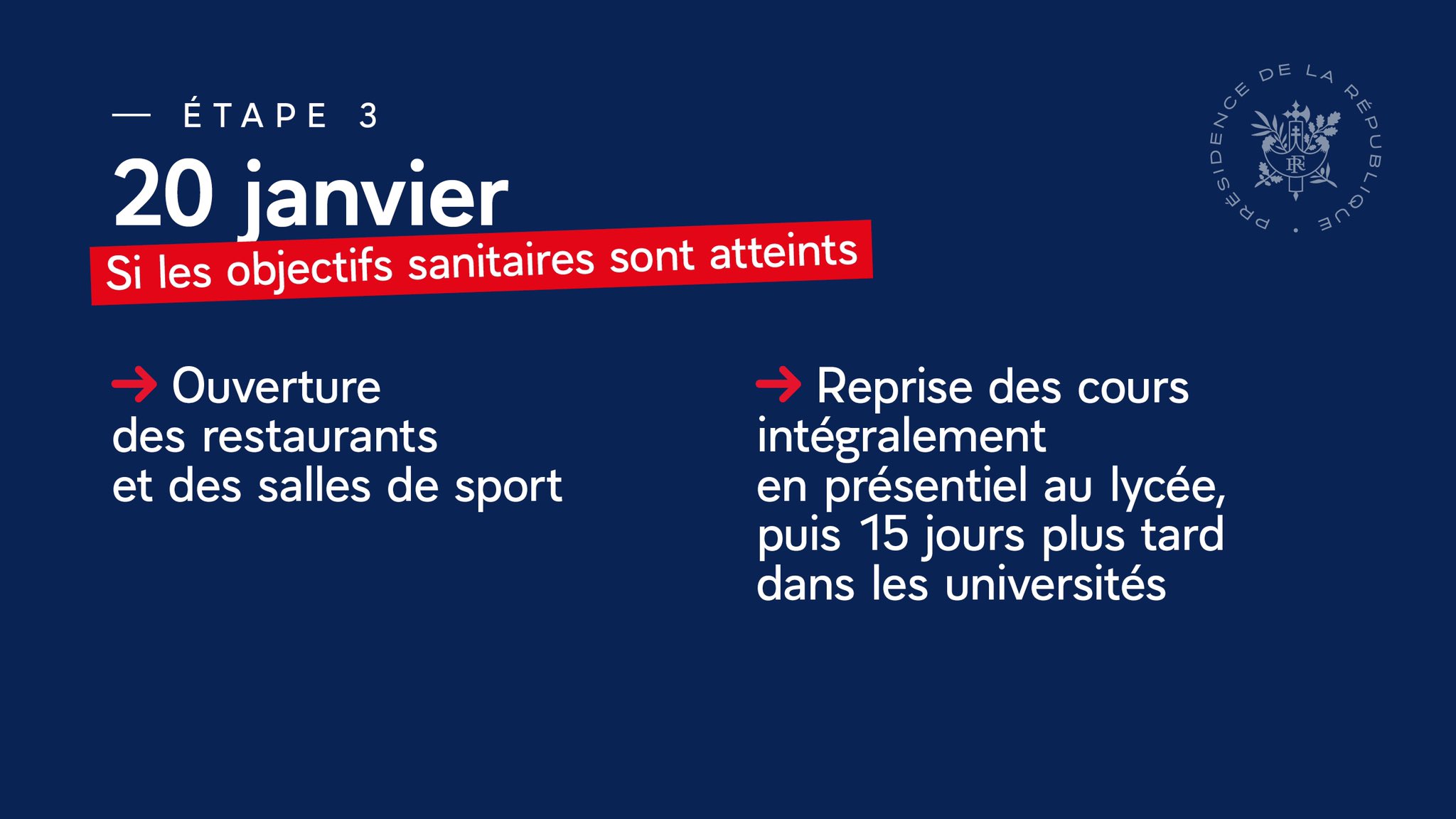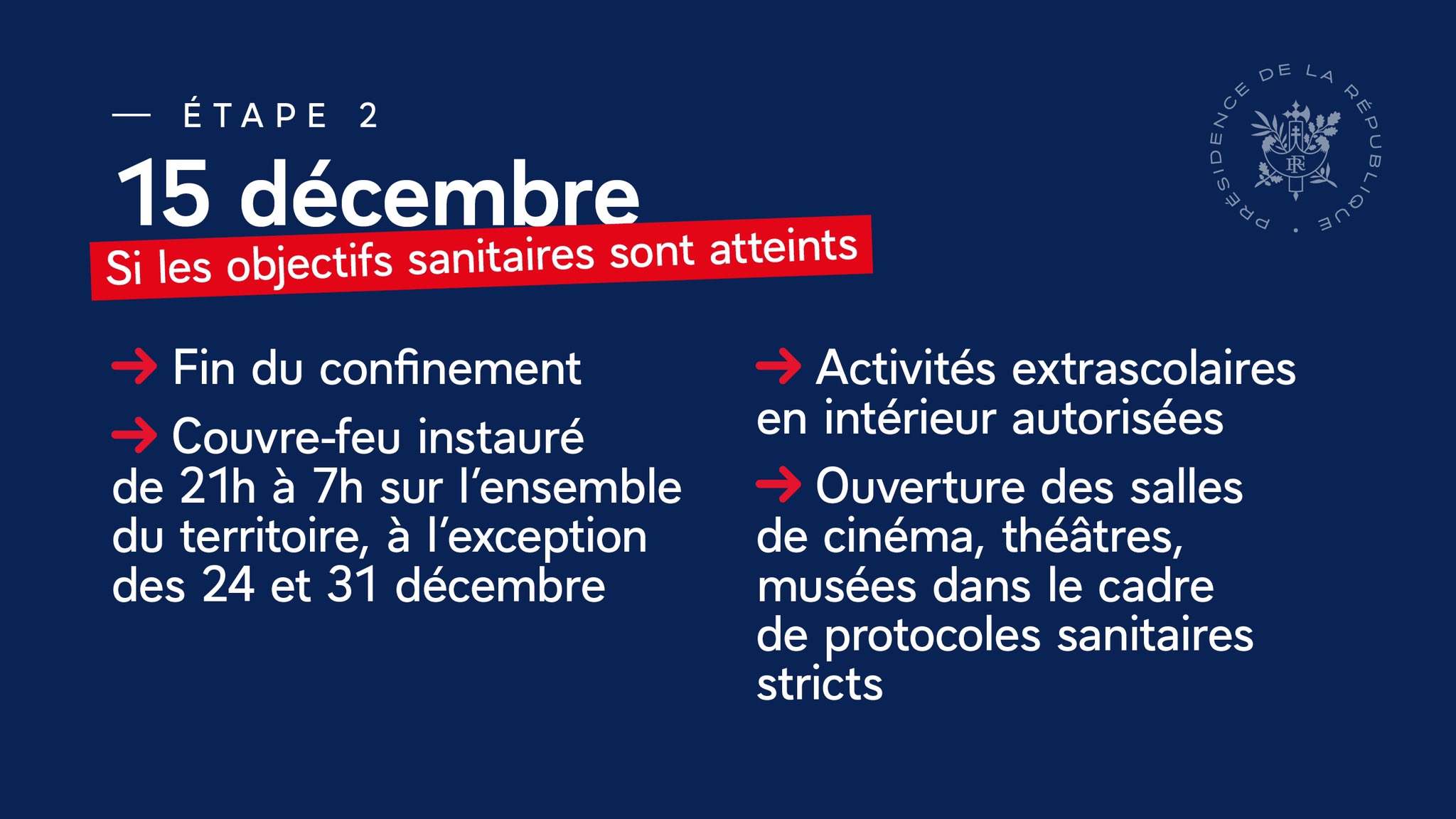 Un déconfinement progressif en 3 étapes a été présenté par le chef de l’Etat ce mardi soir avec entre autres, la réouverture des commerces dits non essentiels dès le samedi 28 novembre , les offices religieux seront à nouveau autorisés dans la limite de 30 personnes. « Le confinement adapté et le système de l’attestation resteront en vigueur», a précisé Emmanuel Macron. La seconde étape débutera le 15 décembre avec l’instauration d’un couvre-feu de 21h à 7h. « Nous pourrons nous déplacer sans autorisation y compris entre régions, passer Noël en famille», a déclaré Emmanuel Macron. « Il ne s’agira pas de vacances de Noël comme les autres […] il faudra au maximum limiter les déplacements inutiles».Enfin, à partir du 20 janvier, si le nombre de contaminations demeure en-dessous de 5000 cas par jour, les salles de sport, les bars et les restaurants pourront rouvrir.