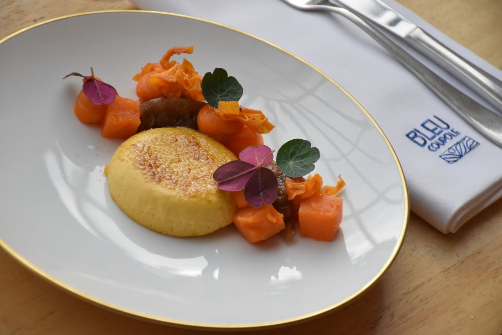 Pour Noël, le chef revisite un grand classique avec une proposition surprenante et raffinée : la crème brûlée au foie gras et à la patate douce. Le gras noble du canard rencontre la douceur sucrée de la patate douce, relevée d’une pointe d’épices. En bouche, c’est un jeu de textures et de contrastes : le craquant du caramel, le fondant de la crème, la profondeur du foie gras.