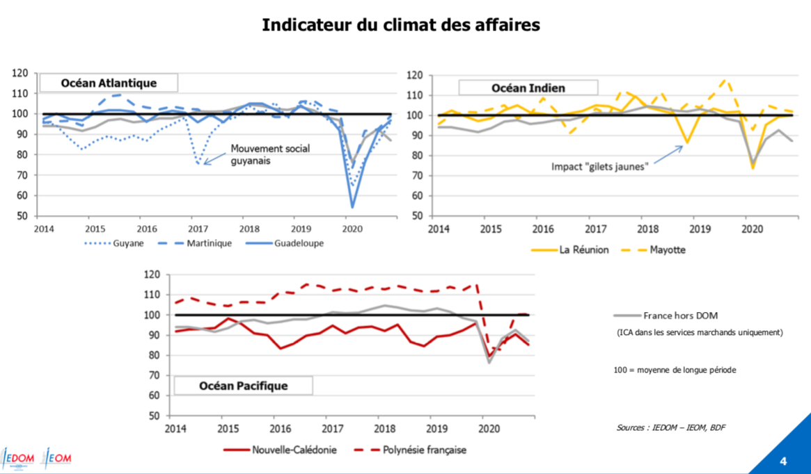 En 2020, l’Indicateur du climat des affaires a très sensiblement reculé au premier trimestre dans l’ensemble des territoires et plus particulièrement dans le bassin Antilles-Guyane et en Polynésie française. A l’issue du choc du premier confinement, le rebond a été conséquent partout, en particulier dans l’Océan Indien. Cela s’est traduit par un impact de la crise sanitaire sur l’activité des entreprises finalement plus limité que ce qui était anticipé au début de l’année 2020, les Outre-Mer ayant largement utilisé les dispositifs d’accompagnement de l’État et des collectivités,notamment les PGE, le fonds de solidarité et les dispositifs de soutien de l’emploi.
