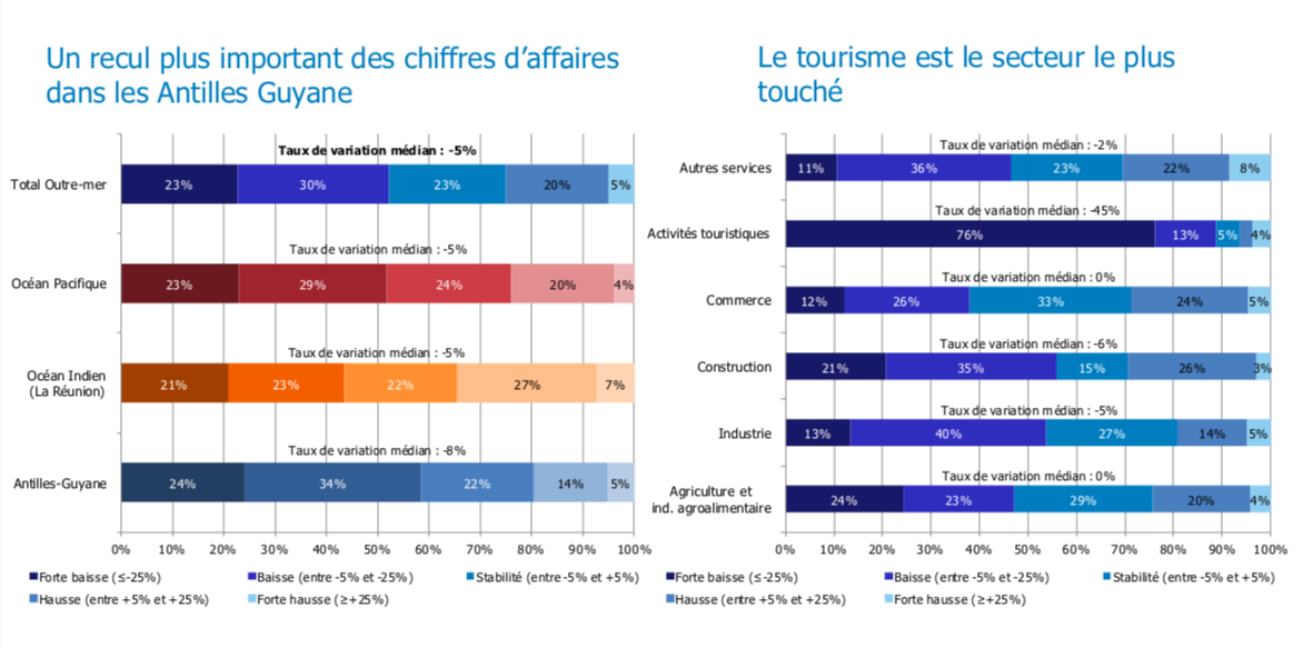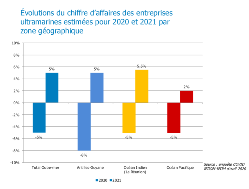 S’agissant de la confiance des chefs d’entreprise, la dernière enquête de conjoncture des Instituts d’Émission prévoit un rebond modéré de leur chiffre d’affaires en 2021 (+5 % pour l’ensemble des Outre-mer), plus perceptible dans les bassins Antilles-Guyane et dans l’Océan Indien. La situation dans le secteur du tourisme est la plus préoccupante puisque les chefs d’entreprise n’anticipent aucun rebond de leur chiffre d’affaires en 2021, après un effondrement de 45 % en 2020. Cette anticipation traduit l’absence de visibilité réelle pour l’ensemble de l’écosystème touristique (hôtellerie, restauration, services, transports...), situation préjudiciable au redémarrage économique de la Polynésie française mais aussi des Antilles.