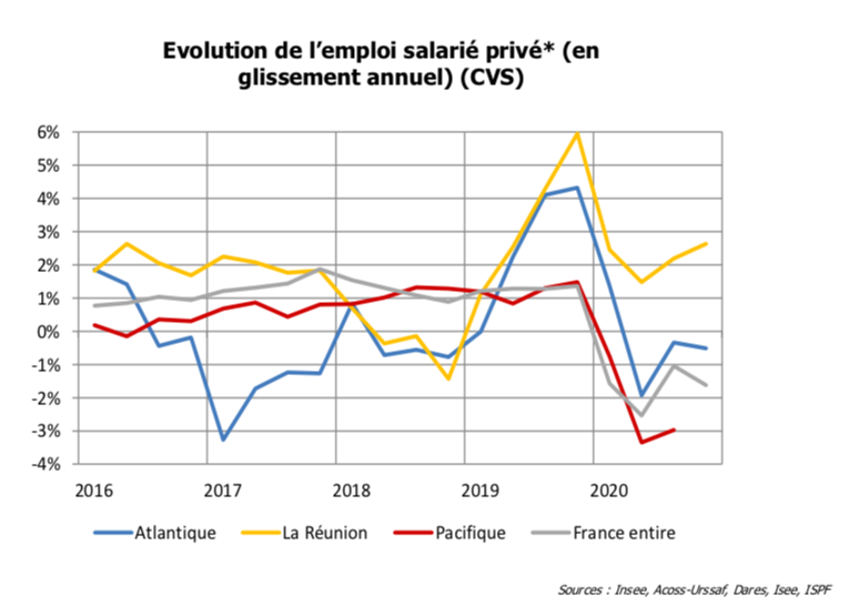 Les Instituts d’émission d’Outre-mer expliquent également que le poids du secteur public a joué un rôle d’amortisseur qui, conjugué aux dispositifs existants de protection sociale, a permis de maintenir la consommation des ménages, moteur essentiel de l’activité. L’emploi salarié privé a été quasiment préservé sur tout le bassin Atlantique, notamment grâce au chômage partiel. Il a régressé de 1,4% en Nouvelle-Calédonie, donc moins que dans l’Hexagone (-1,7%) ; il affiche même une progression en Guyane et à La Réunion. Seule la Polynésie française s’inscrit dans une régression plus marquée que l’Hexagone.