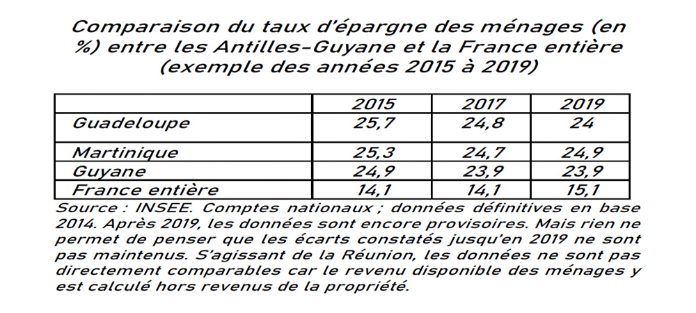 Deuxième constat : « l’épargne locale, plus abondante Outre-mer que dans l’Hexagone, n’est pas mise au service du développement des territoires ultramarins », d’après UltraLab (voir ci-dessous le tableau concernant le taux d’épargne des ménages aux Antilles-Guyane). Cette « sur-épargne » s’explique notamment par les majorations de traitement ou sur-rémunérations, et par une réduction – plafonnée - de l’’impôt sur le revenu (30 à 40% selon les territoires) dont est bénéficiaire la majeure partie des contribuables des DROM.