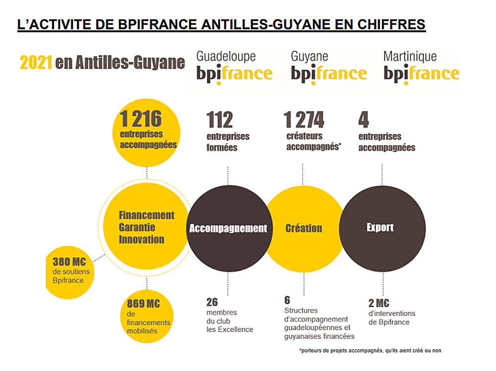 En 2021, BPIfrance Antilles-Guyane a soutenu 1216 entreprises à hauteur de 380 millions d’euros, permettant de mobiliser 869 millions de financements publics et privés, a annoncé Michèle Papalia, la directrice régionale. « L’activité de Crédit est intense dans les Antilles et en Guyane, avec 129 M€ injectés dans 385 entreprises (+ 4% par rapport à 2020) pour financer des projets de développement. Les Prêts Sans Garantie, produit phare du réseau de la banque, représentent 61 M€ décaissés dans 378 projets de développement, dont notamment 3,5 M€ de Prêts Verts dans la Collectivité territoriale de Guyane pour financer des projets améliorant l’impact environnemental et énergétique des entreprises », écrit-elle.