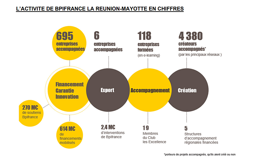 À La Réunion et à Mayotte, en 2021, BPIfrance a soutenu 695 entreprises à hauteur de 270 millions d’euros, permettant de mobiliser 614 millions de financements publics et privés. Selon le directeur régional Jean-Marc Battigello, « l’activité de Crédit à La Réunion et à Mayotte a atteint 116 M€ injectés dans 170 entreprises, dans les projets de développement des entreprises. Les Prêts Sans Garantie, produit phare du réseau de la banque, ont quant à eux représenté 61 M€ décaissés dans 158 projets de développement, dont 4 M€ de Prêts Verts dans la Région réunionnaise ». Par ailleurs, il ajoute que les financements ont doublé à La Réunion et à Mayotte par rapport à 2020 : 73 entreprises ont reçu 16 millions afin de développer leurs projets d’innovation, moderniser leur équipement technologique, ou pour augmenter leur capacité de production en France.
