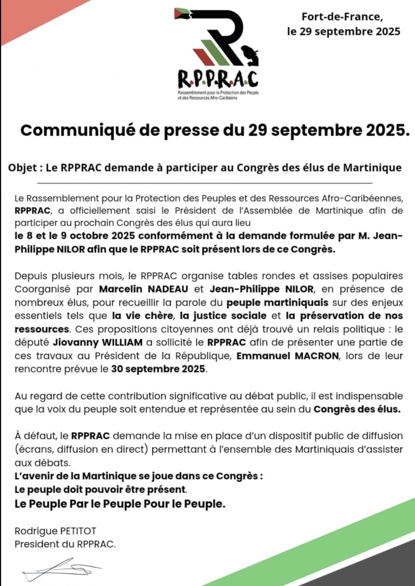Le nom du parti "est l'expression d’une volonté populaire" et a été choisi à l'issue d'une "grande tournée Matinik Tour" menée au cours de l'été, ajoute le communiqué, sans préciser si le parti présentera des candidats aux élections à venir. "Il s'agit (...) d'avoir des candidats au sein d'un parti politique qui portent l'idéologie du RPPRAC”, a déclaré Rodrigue Petitot dans une vidéo live sur le réseau social TikTok.