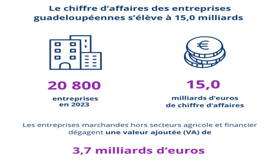 Guadeloupe. En 2023, les secteurs marchands hors agriculture et finances rassemblaient 20 820 entreprises en Guadeloupe. Ensemble, elles ont généré un chiffre d’affaires total de 15 milliards d’euros, correspondant à la valeur globale des ventes de biens, marchandises et services. Parmi elles, les entreprises principalement orientées vers le commerce ont réalisé un chiffre d’affaires de 6,8 milliards d’euros, soit 46% du total régional, confirmant ainsi ce secteur comme le pilier économique de la Guadeloupe. Les autres secteurs marchands implantés sur le territoire contribuent quant à eux à hauteur de 8,2 milliards d’euros.