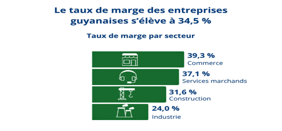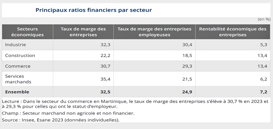 « Le taux de marge des entreprises, calculé en rapportant l’excédent brut d’exploitation (EBE) à la valeur ajoutée, atteint 32,3% en 2023 pour l’ensemble des entreprises guadeloupéennes », dégageant une valeur ajoutée de 3,7 milliards d’euros, rapporte l’Insee. Les entreprises qui avaient le taux le plus élevé étaient concentrées dans l’industrie (39,1%). Les taux s’avéraient plus faibles dans le secteur de la construction (32%), des services marchands (31,7%) et du commerce (29,7%).