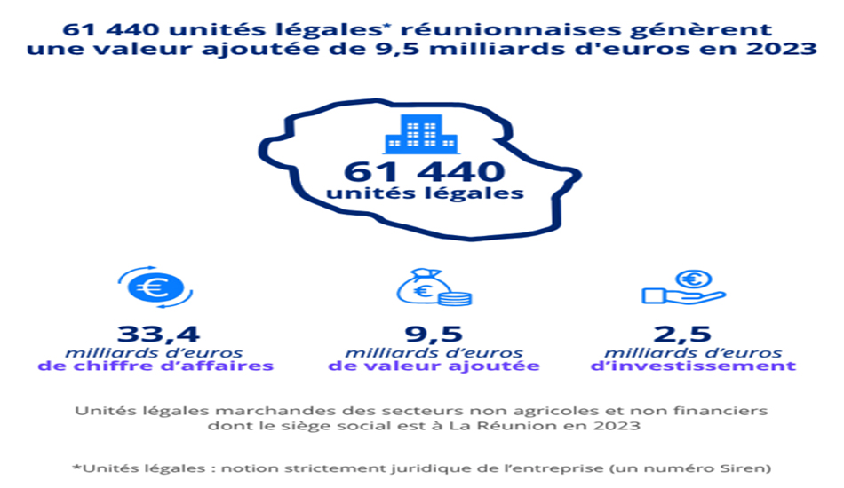 La Réunion. En 2023, les entreprises marchandes réunionnaises, hors secteurs agricole et financier, ont généré 9,5 milliards d’euros de valeur ajoutée pour un chiffre d’affaires total de 33,4 milliards d’euros. Leurs investissements s’élevaient à 2,5 milliards d’euros. Sur l’île, la majorité des unités légales sont de très petite taille : sept sur dix ne comptent aucun salarié. « Toutefois, l’activité économique de l’île est majoritairement portée par les structures de 10 à 249 salariés : elles regroupent 57% des salariés, réalisent 55% du chiffre d’affaires et génèrent 46% de la valeur ajoutée », souligne l’Insee.