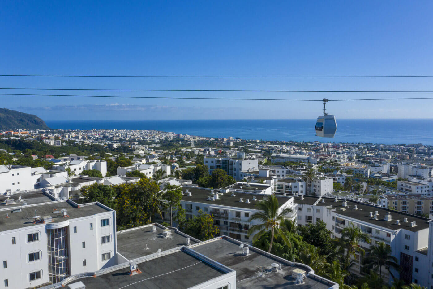 Dans les Outre-mer, l’exemple le plus abouti reste aujourd’hui le téléphérique Papang, à Saint-Denis de La Réunion. Inauguré en mars 2022, ce premier téléphérique de l’océan Indien, long de 2,68 kilomètres, relie le quartier du Chaudron à celui de Bois-de-Nèfles, en passant par le Moufia. Le trajet s’effectue en 14 minutes, avec cinq stations intermédiaires. Les 46 cabines de dix places permettent de transporter jusqu’à 1 200 passagers par heure et par sens.