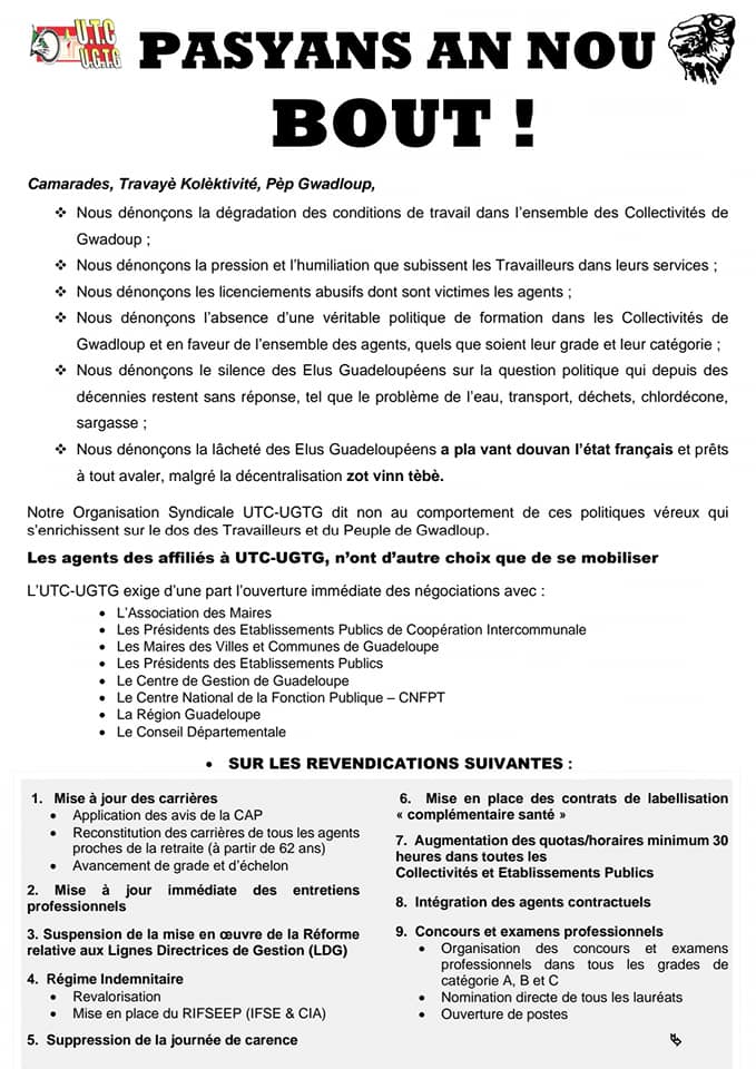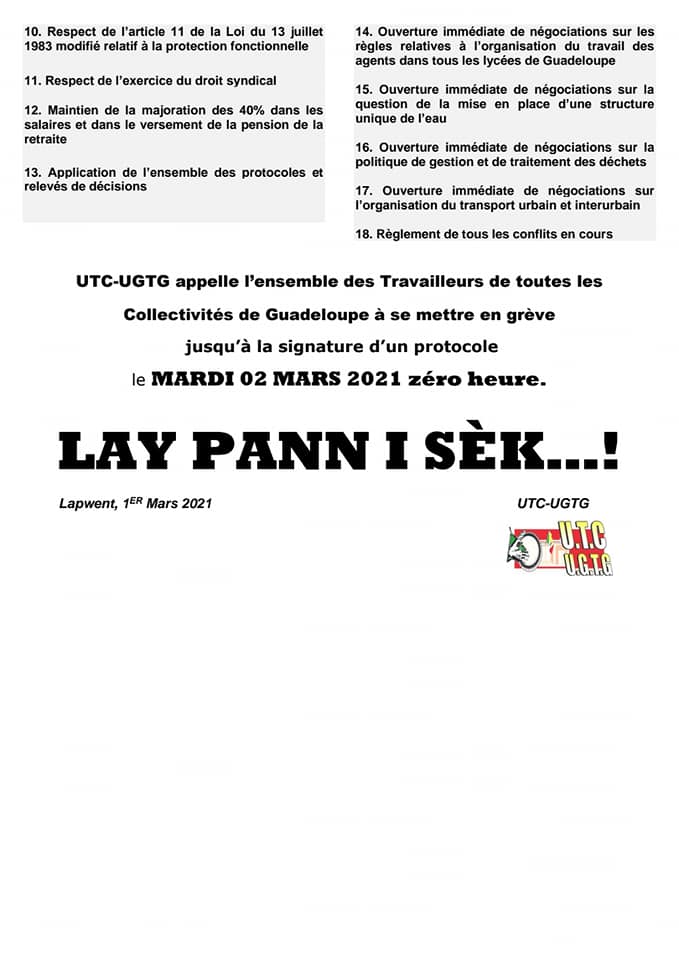L’Union des Travailleurs des Collectivités – Union Général des Travailleurs de Guadeloupe (UTC-UGTG) a entamé son mouvement de grève qu’il veut général depuis ce mardi 2 mars. Axé sur la fonction publique, 18 points de revendication et une demande d’ouverture des négociations immédiate par le syndicat, alors que des piquets de grève ont été installés devant plusieurs mairies du territoire.