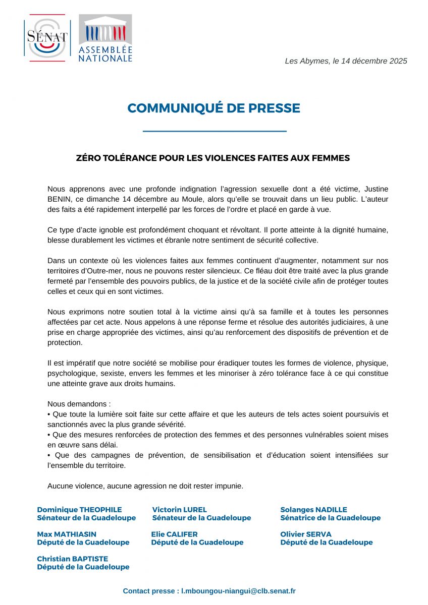 Les sénateurs et députés guadeloupéens, Dominique Théophile, Max Mathiasin, Christian Baptiste, Victorin Lurel, Elie Califer, Solanges Nadille et Olivier Serva ont publié un communiqué commune, ce dimanche 14 décembre, dans lequel ils font également part de leur indignation.