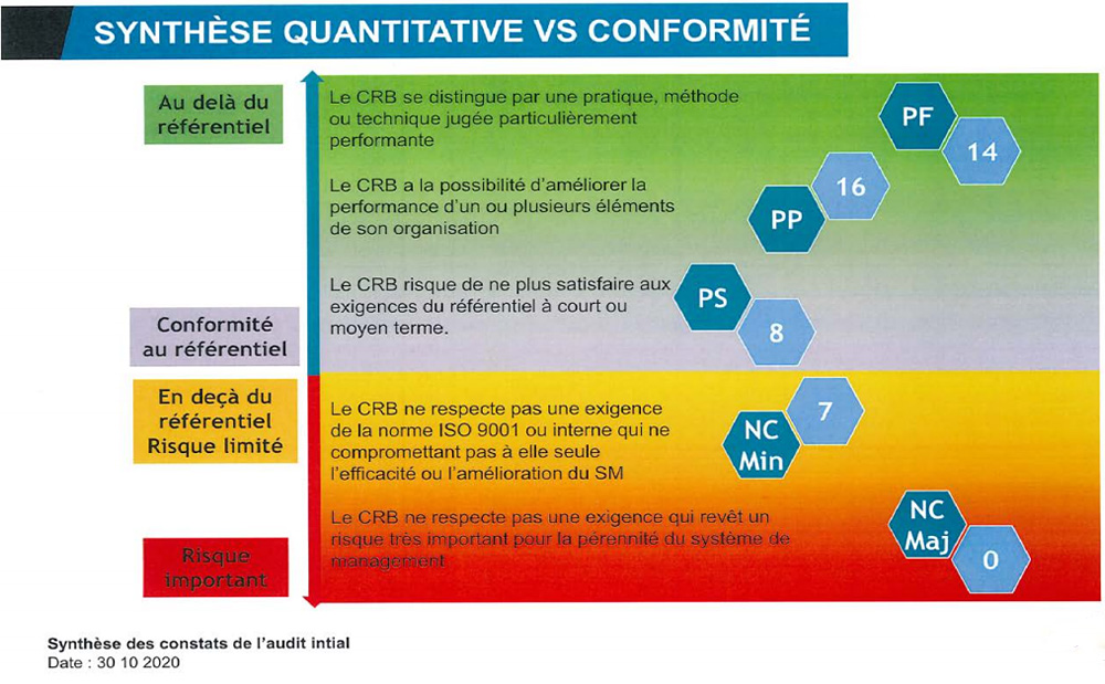 Situation de l’audit initial du CRB au 30 octobre 2020. Avant d’apporter des améliorations, l’organisme se situait déjà au-delà du référentiel