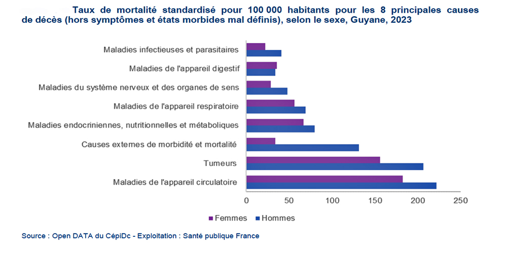 En 2023, les taux de mortalité liés aux tumeurs, aux troubles mentaux et du comportement, ainsi qu’à certaines affections dont l’origine remonte à la période périnatale, étaient significativement plus faibles que dans la France entière. Il convient toutefois de souligner que la mortalité par tumeur de la prostate est plus élevée en Guyane (21,6 décès pour 100 000 habitants) qu’au niveau hexagonal (11,3). Aucune différence notable n’a été observée concernant les maladies du système nerveux et des organes des sens — incluant notamment la maladie de Parkinson et la maladie d’Alzheimer —, les malformations congénitales et anomalies chromosomiques, ainsi que la COVID‑19.
