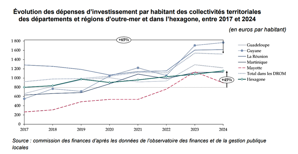 En ce qui concerne le soutien de l’État à l’investissement local, il pourrait être mieux mobilisé, relève le document : « La répartition des fonds contractualisés dans le cadre des CCT (contrats de convergence de transformation, ndlr) dans chaque collectivité ultramarine est relativement déséquilibrée. Par exemple, les montants investis par habitant en Guyane, de 1702 euros en moyenne entre 2019 et 2023, et de 1949 euros entre 2024 et 2027, sont étonnamment bas, au vu des enjeux importants en termes d’investissement de ce territoire soumis à des contraintes géographiques très fortes ».