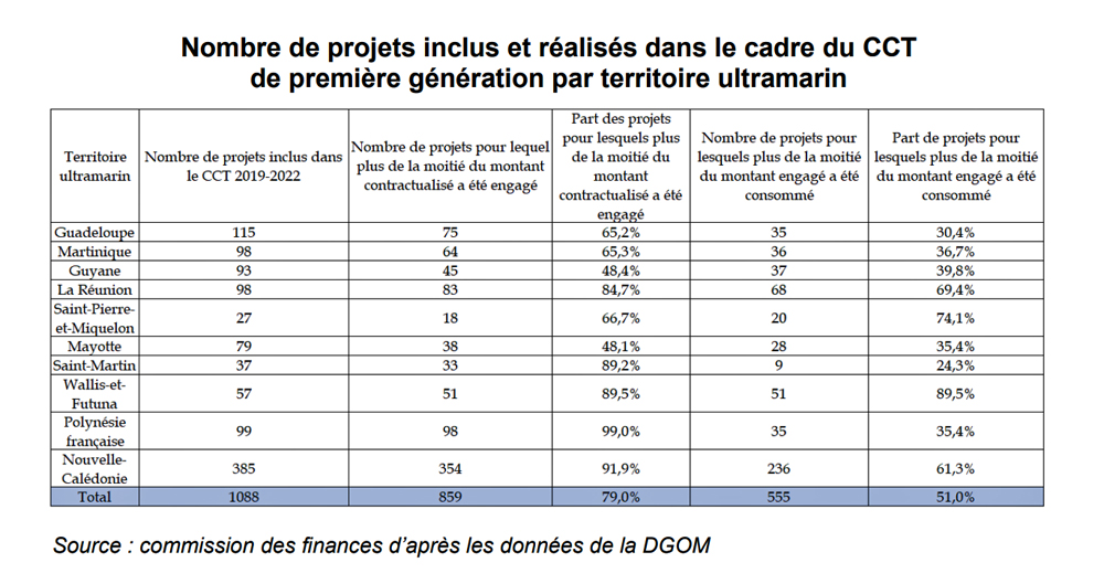 Par ailleurs, les rapporteurs observent que plusieurs facteurs conjoncturels ont freiné la mobilisation des crédits liés aux CCT : la signature tardive des contrats, les perturbations liées à la crise sanitaire, la priorité donnée à l’engagement et au paiement des crédits du plan de relance au détriment de ceux du CCT — entraînant ainsi un effet d’éviction — ainsi que les mouvements sociaux survenus fin 2021 aux Antilles et dans le Pacifique. Parmi les autres difficultés structurelles rencontrées, on peut noter également « la gestion d’un grand nombre d’opérations ; le manque de maturité de certains projets contractualisés au début de la période, rendant impossible l’engagement et le paiement des crédits pourtant disponibles ; et le défaut de structuration et d’organisation de l’ingénierie publique pour la réalisation des opérations ».