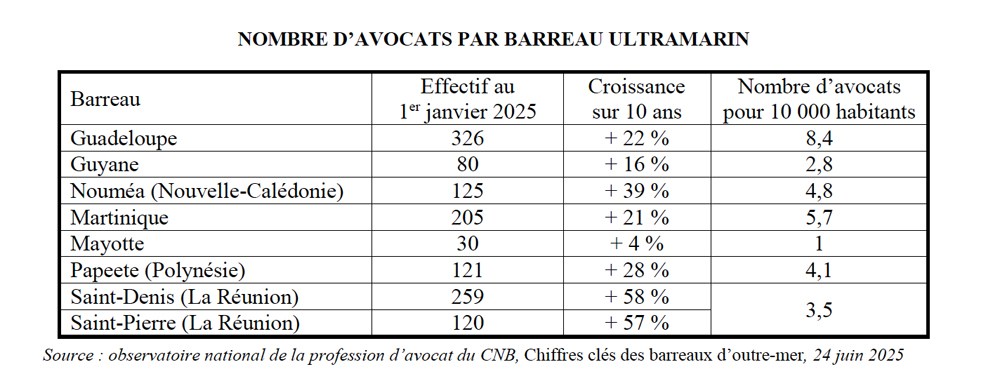 NB : il y a 11 avocats pour 10 000 habitants dans l'Hexagone. Wallis et Futuna et Saint-Pierre et Miquelon ne disposent pas de barreaux.