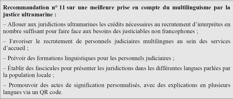 Par ailleurs, les Outre-mer ne peuvent être appréhendés sans une prise en compte attentive de leurs spécificités culturelles. Dans de nombreux territoires, la justice demeure perçue comme une institution lointaine, parfois déconnectée des réalités quotidiennes et des traditions locales. « Cela commence par l’enjeu de la langue : en Guyane, à Mayotte ou encore à Wallis-et-Futuna, le français n’est pas la langue maternelle de nombreux citoyens. Il devient alors nécessaire de généraliser le recours à des interprètes », préconise le rapport, « même si, en pratique, la traduction repose en grande partie sur le personnel de greffe ou d’accueil des juridictions, capable de maîtriser ces langues lorsqu’il est originaire du territoire ».