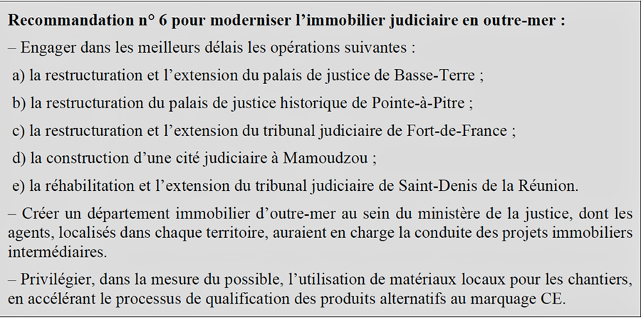 Le rapport souligne également que l’arrêt des investissements dans l’immobilier judiciaire Outre-mer est difficilement justifiable. « Il est difficile d’imaginer une justice de qualité dans un contexte où les conditions de travail et l’accueil des justiciables demeurent aussi dégradés », dit le texte. Si des progrès significatifs ont été accomplis dans les années 2010, l’ampleur des chantiers encore nécessaires demeure considérable.