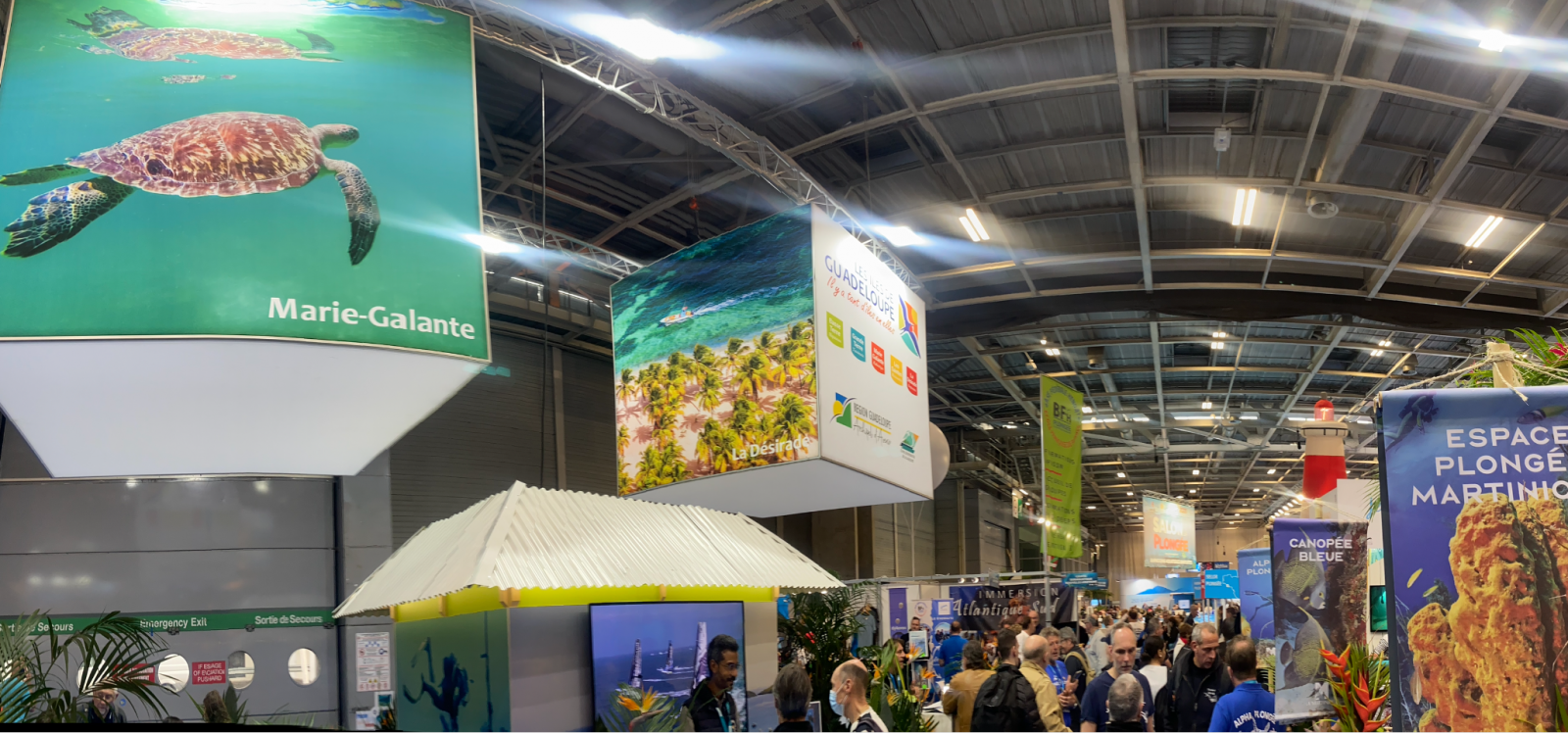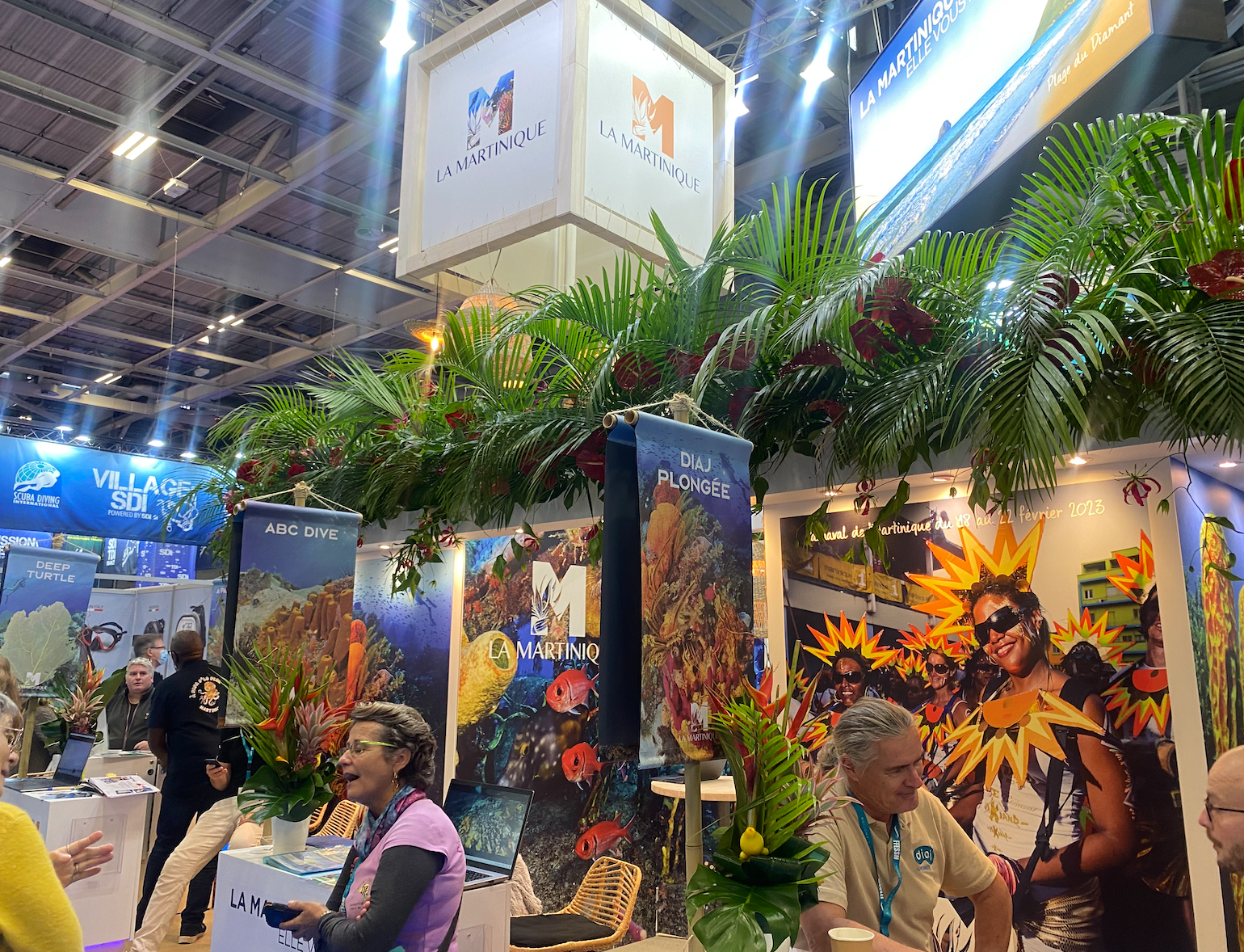 Pas très loin du stand de la Nouvelle-Calédonie se dresse le stand de la Martinique. Au sein de la délégation, ce sont neuf clubs de plongée qui sont représentés. Pour Jean-Roger Salinière du Comité Martiniquais du Tourisme, la délégation est totalement dans le thème de cette année : « Nous avons justement deux nouveaux clubs qui ont développé un axe développement durable, éco-responsable grâce à des bateaux qui sont électro solaires. Ainsi, les passagers peuvent eux-mêmes recharger leurs bouteilles à l’aide de l’énergie solaire ».