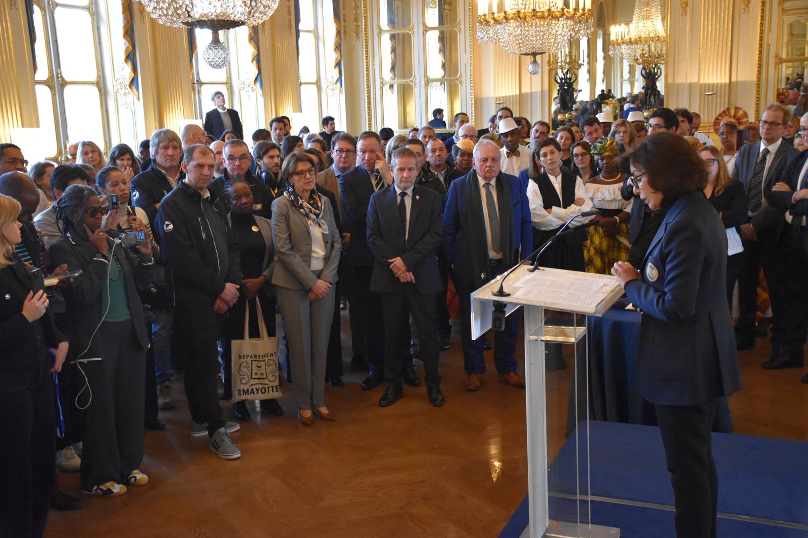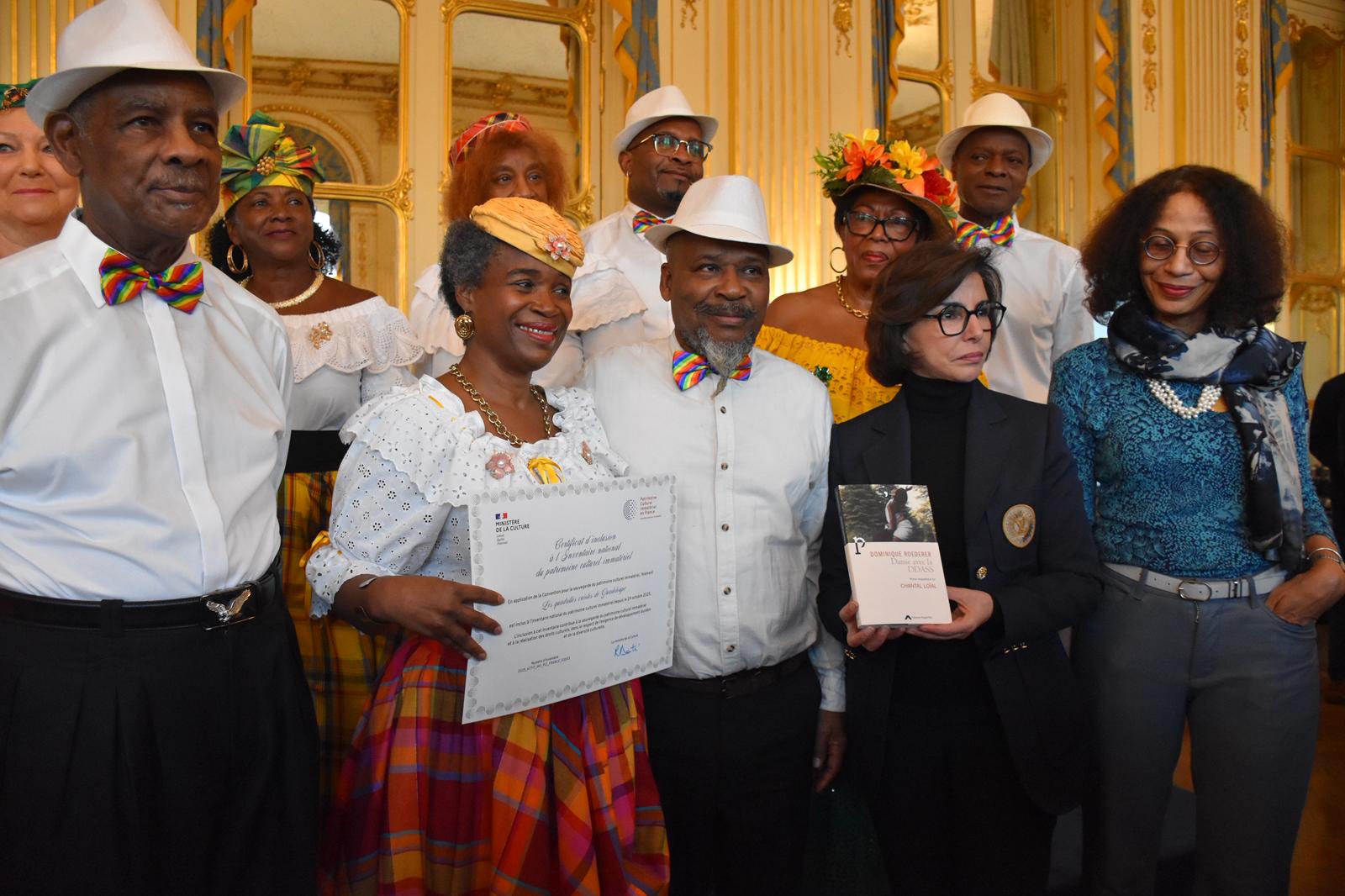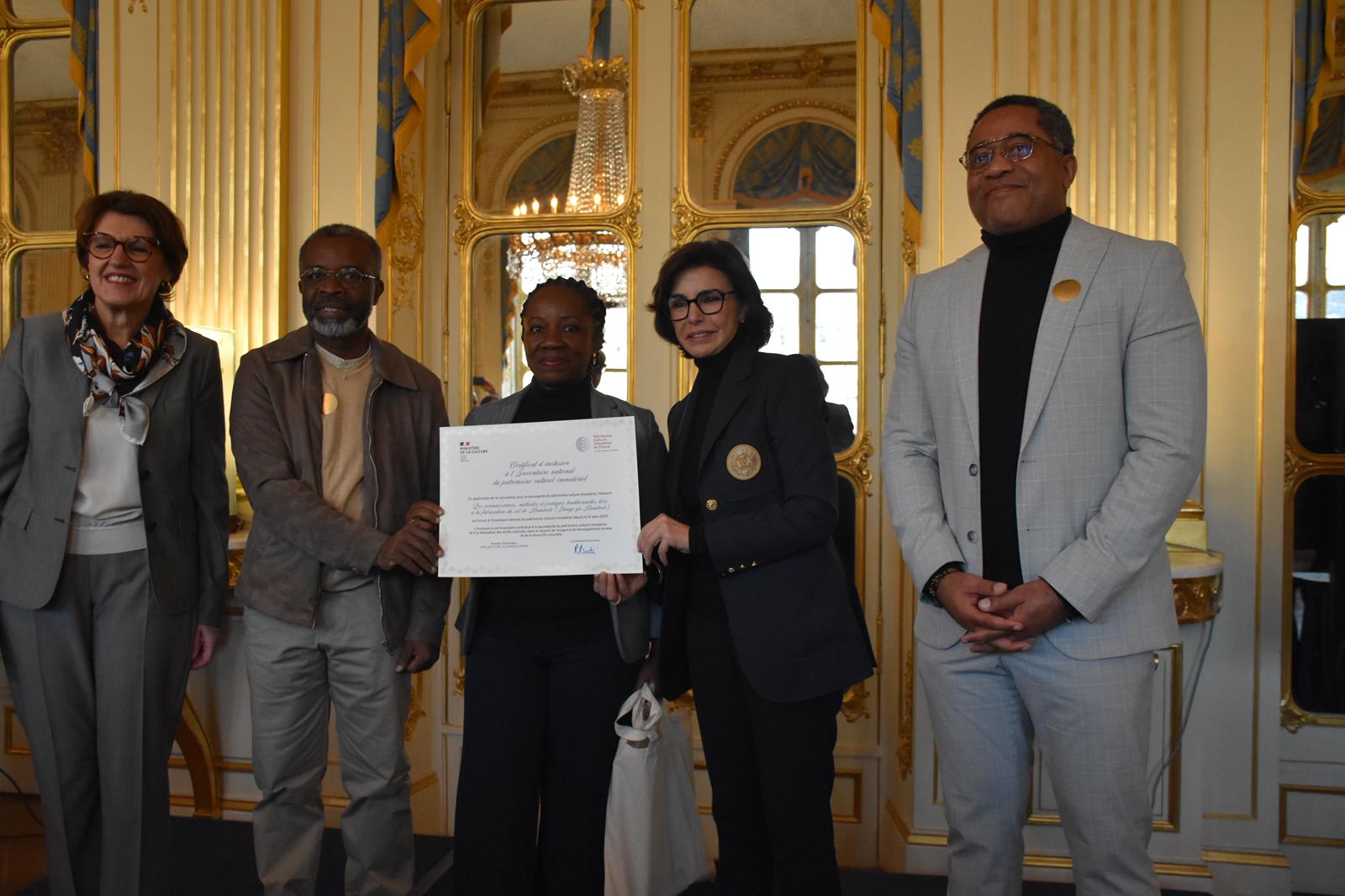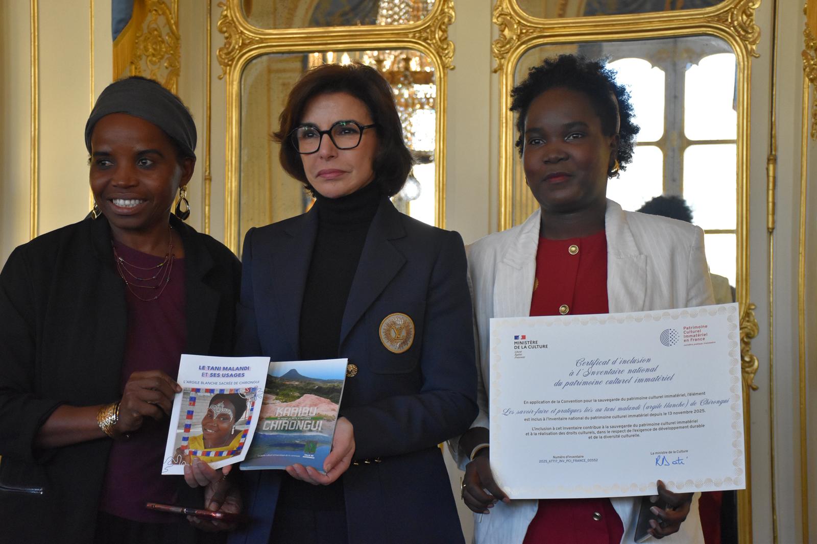 Dans le salon d'honneur du Palais-Royal, la Ministre de la Culture Rachida Dati a présidé ce mercredi 17 décembre la cérémonie d'inclusion de nouveaux élements à l’Inventaire national du Patrimoine culturel immatériel (PCI), en présence de nombreux représentants d'associations défendant ces savoirs et pratiques culturels, venant de l'Hexagone mais aussi des outre-mer. Durant cette cérémonie, trois territoires ultramarins ont été mis à l'honneur : Les quadrilles créoles de la Guadeloupe, la broderie du Cilaos à La Réunion et Mayotte avec les savoirs et pratiques ancestrales de la production de sel de bandrélé, le debaa ainsi que le tani malandi de Chirongui.