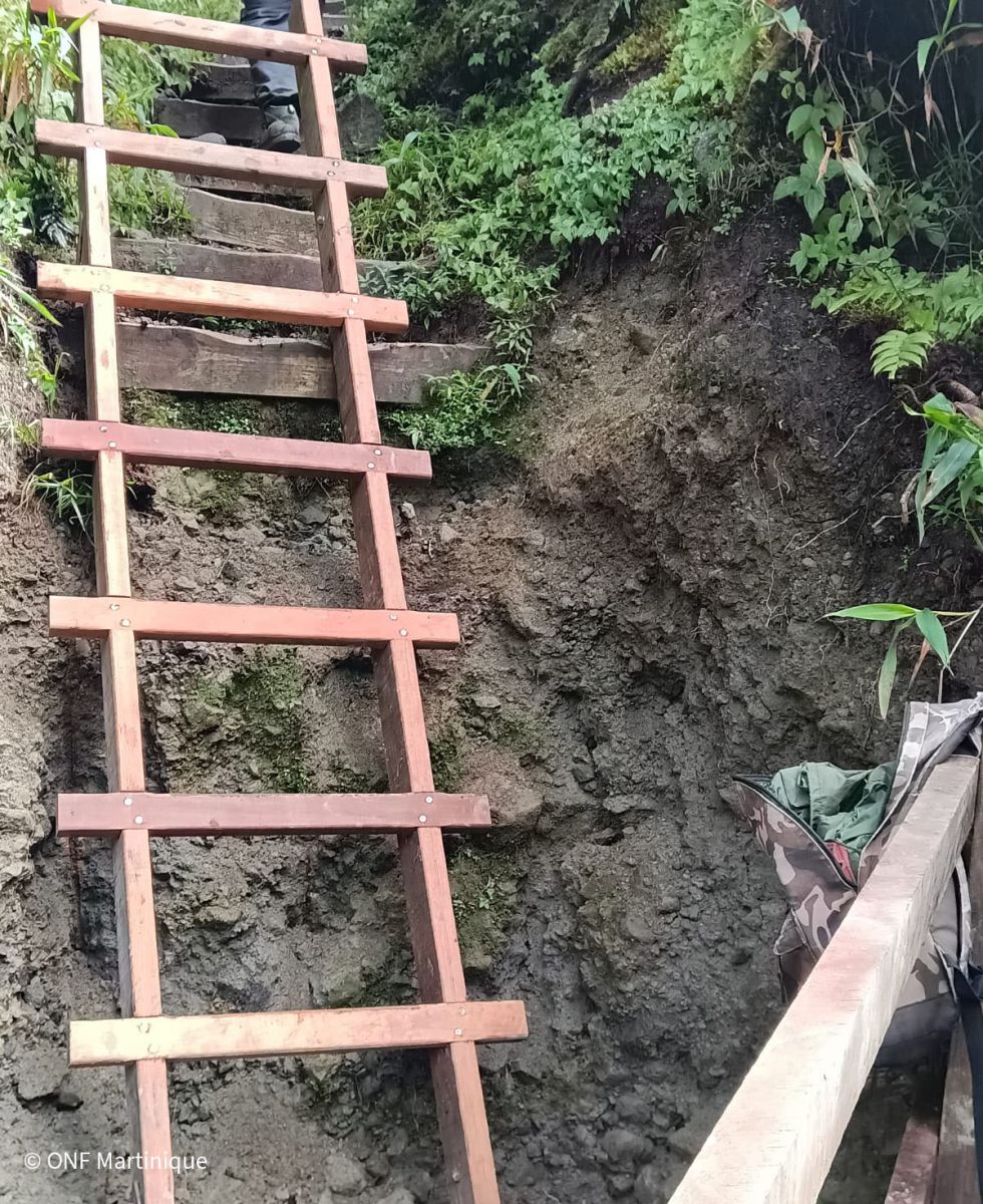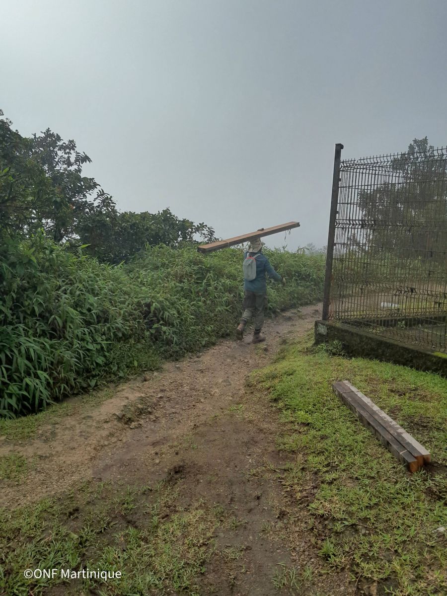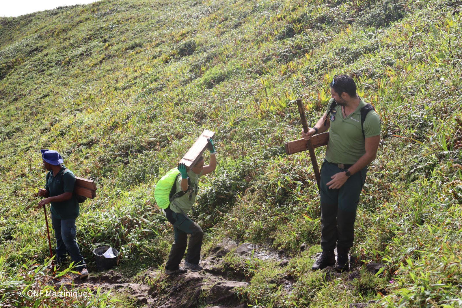 C'est grâce à la mobilisation de 28 agents issus de différents services de l’ONF, notamment de l’administratif, de la comptabilité et du système d’information géographique, ont participé à l’acheminement de matériaux jusqu’au deuxième refuge de la Montagne Pelée, en appui aux ouvriers de l’atelier bois. Cette mobilisation visait à permettre la réalisation de travaux d’aménagement sur les sentiers menant à la caldeira.