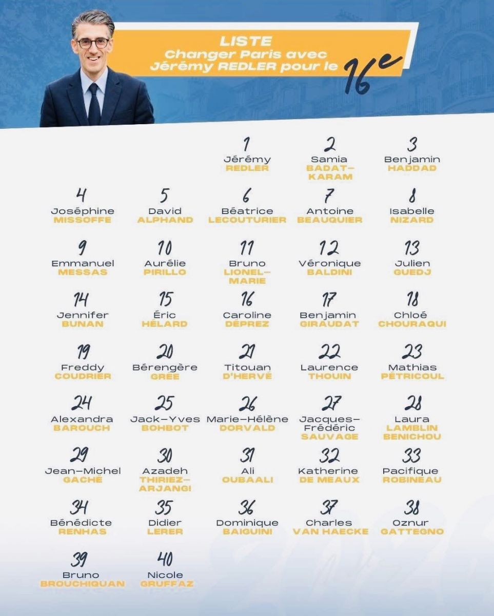 Élections municipales 2026 – listes en course à la Mairie du 16e Jérémy Redler — Liste Les Républicains (droite) - « Changer Paris » avec Samia Badat-Karam en 2e position ![]() Geneviève Garrigos — Liste Union de la gauche (PS-écologistes-alliés) Emmanuelle Hoffmann — Liste d’union au centre (LUC) Oscar Maslard — Liste La France insoumise (LFI) Sarah Knafo — Liste Reconquête Louis Piquet — Liste Union des Droites pour la République (UDR) |