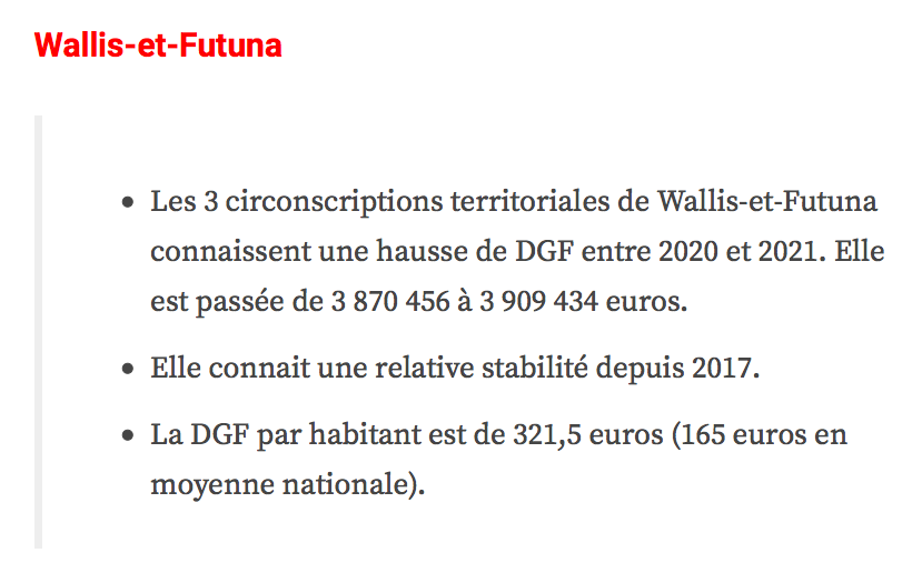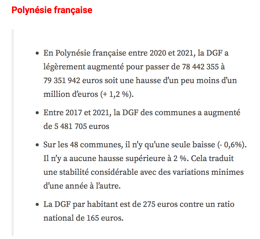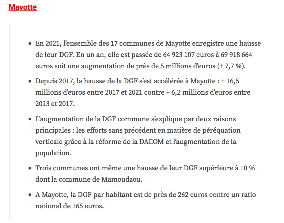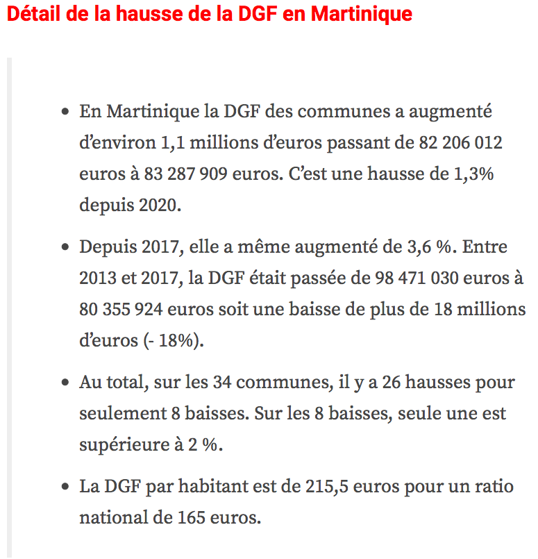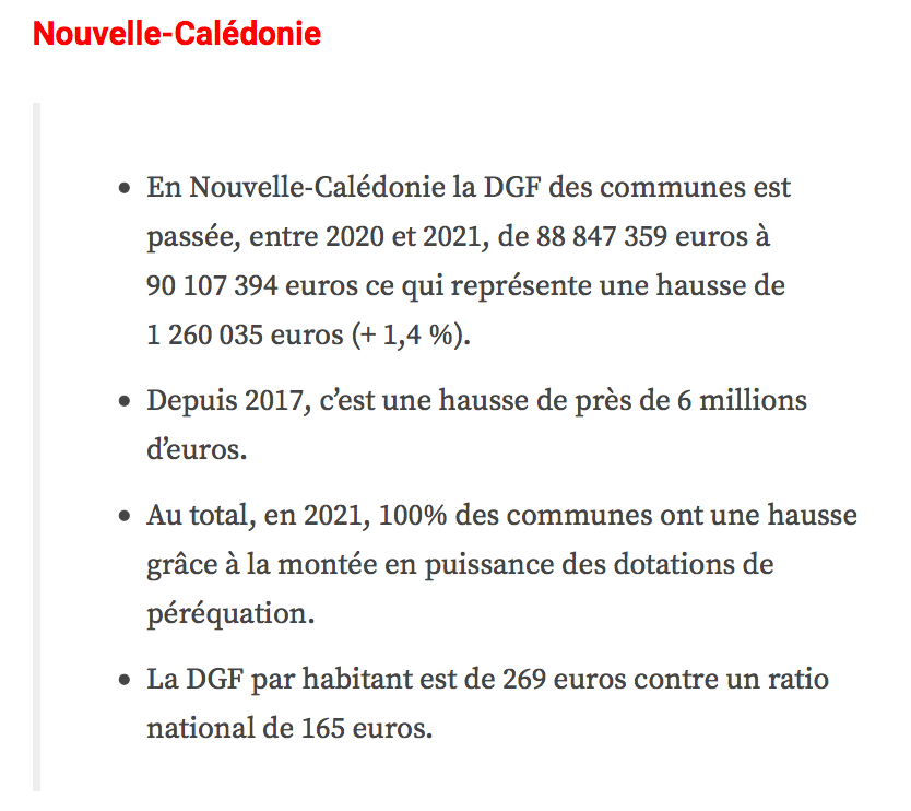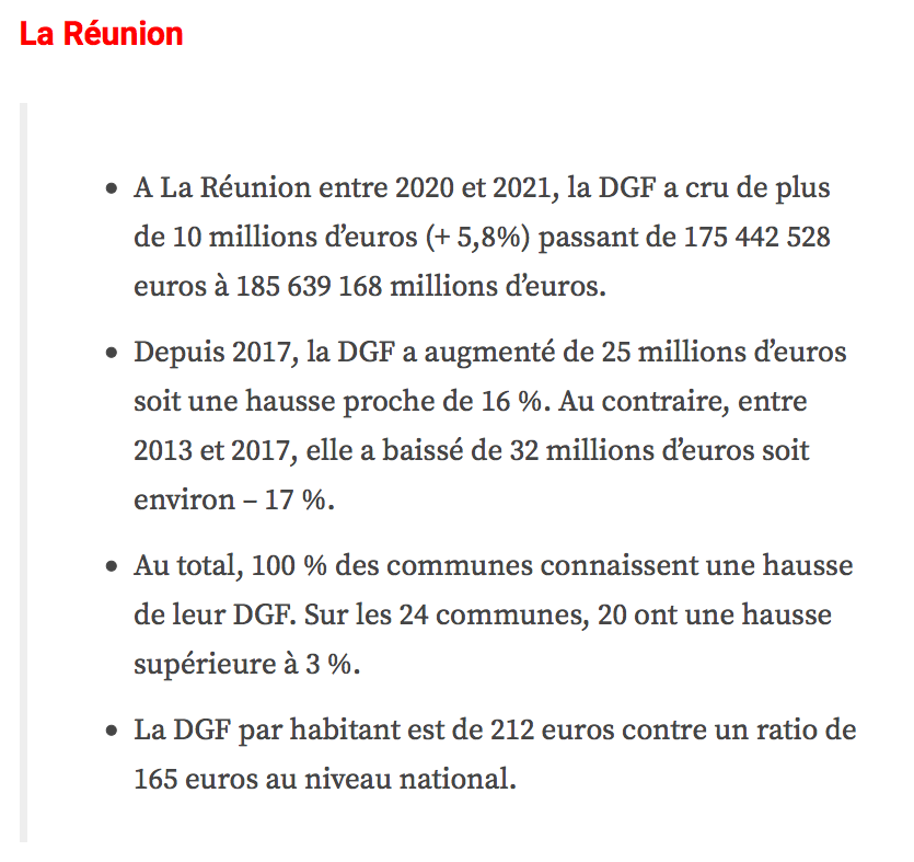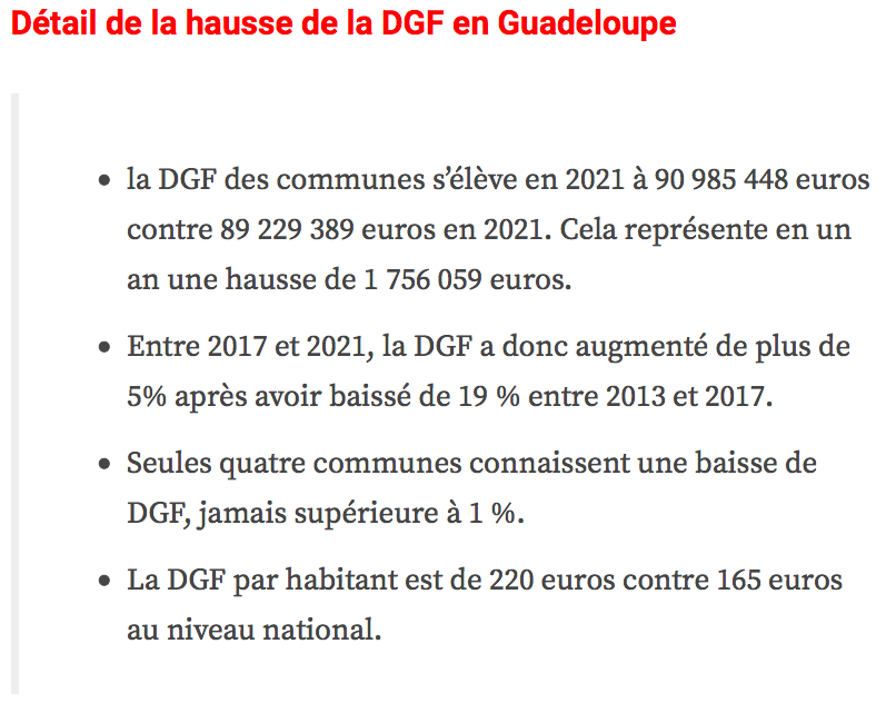 Les attributions individuelles de dotation globale de fonctionnement (DGF) versées en 2021 par l’État aux collectivités territoriales viennent d’être rendues publiques. Les montants dont bénéficieront les territoires d’Outre-mer sont, cette année encore, en augmentation, traduisant un effort de solidarité important au sein d’une enveloppe dont le montant national est stable pour la quatrième année consécutive, se félicite le gouvernement.