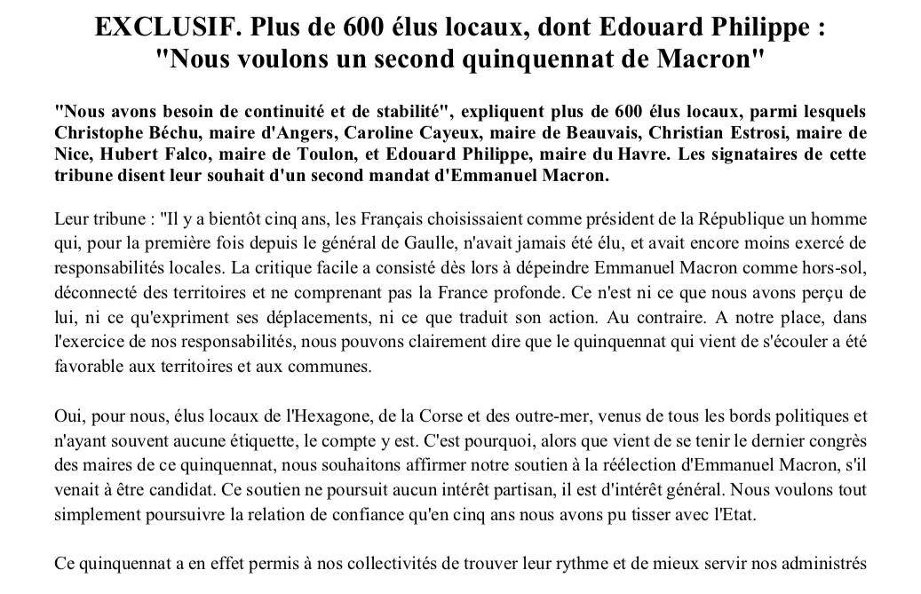 Plus de 600 maires et élus locaux, dont l’ancien Premier ministre Édouard Philippe, maire du Havre, et une centaine de maires Outre-mer, ont lancé samedi un appel pour soutenir la réélection d'Emmanuel Macron à la présidence de la République, en saluant « un quinquennat favorable aux territoires et aux communes », dans une tribune parue dans le Journal du Dimanche.
