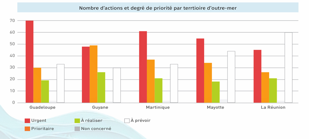 En revanche, les actions de moindre priorité apparaissent globalement homogènes d’un territoire à l’autre (entre 15 et 25 actions), ce qui suggère un niveau de maturité comparable des projets engagés. « En ce qui concerne les actions prioritaires, la Guyane se distingue (plus de 50 actions), suivie de la Martinique (environ 35 actions) et de Mayotte, dont le contexte particulier a été marqué par des événements climatiques récents (Chido et Dikeledi) », conclut la Proposition de stratégie Outre-mer du PNMH4.