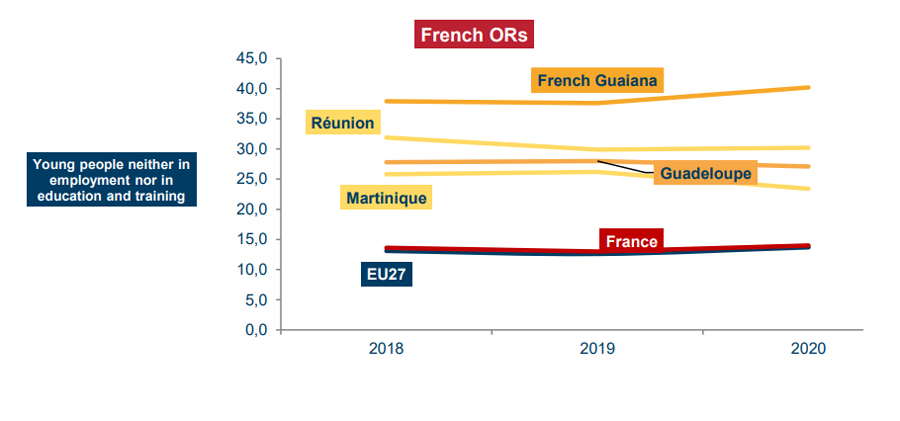 À cela s’ajoutent des problèmes structurels de longue date : « Les taux de chômage des jeunes, qui ne sont ni en emploi, ni en études, ni en formation (NEET) atteignent ou maintiennent des niveaux alarmants dans les RUP. Dans toutes les régions ultrapériphériques, les taux de NEET sont supérieurs aux moyennes européennes (13,7% en 2020) et nationales. Bien que les taux de NEET (15 à 29 ans) dans les RUP françaises n'aient pas changé de manière significative en raison de la crise de la COVID-19, ils sont restés extrêmement élevés en 2020 - entre 23% en Martinique et 40% en Guyane », relève l’étude. La pandémie n’a fait qu’aggraver cette situation.