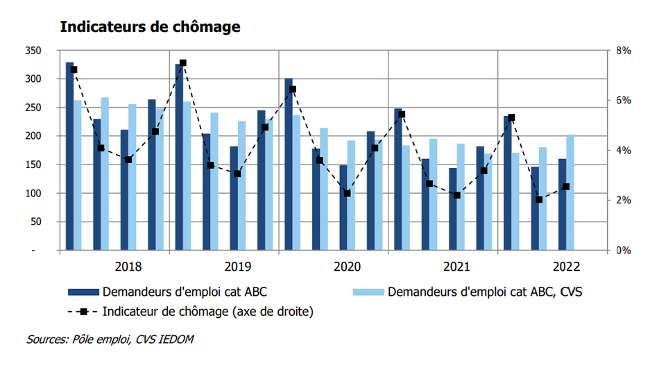 L’organisme souligne que les indicateurs de chômage se sont détériorés au 3e trimestre. « Fin septembre 2022, le nombre de demandeurs d’emploi de catégorie A repart nettement à la hausse sur un an (+25%) et atteint 80 personnes. Le nombre de demandeurs d’emploi de catégorie ABC, c’est-à-dire inscrites à Pole Emploi et tenus de rechercher un emploi, augmente de façon plus modérée sur douze mois (+11,1 %) pour atteindre 160 personnes ». Par ailleurs, les difficultés de recrutement persistent, indique l’IEDOM. Depuis janvier 2022, Pôle Emploi enregistre 272 offres d’emploi pour seulement 180 demandeurs d’emploi en moyenne. Au 3e trimestre, les entreprises du secteur du transport et logistique et du commerce sont les plus touchées par la pénurie de main d’œuvre.