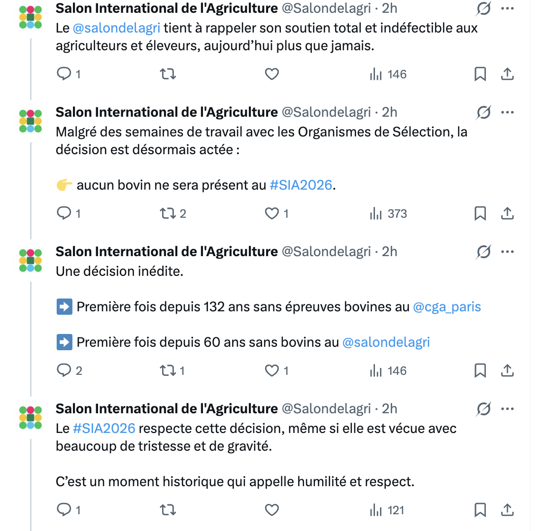 Par conséquent, le Salon adopte une nouvelle communication inédite. La vache Biguine, initialement désignée comme la vache égérie de cette édition 2026 sera remplacée par un nouveau slogan : "venir c'est soutenir". Comme l'explique Arnaud Lemoine, Directeur du Ceneca : «nous ne pouvions pas faire comme si cette situation n'existait pas. En 2026, venir au Salon, c'est un geste clair de soutien envers les agriculteurs, les filières, et envers un Salon qui continue de jouer son rôle de lien entre l'agriculture et les Français»