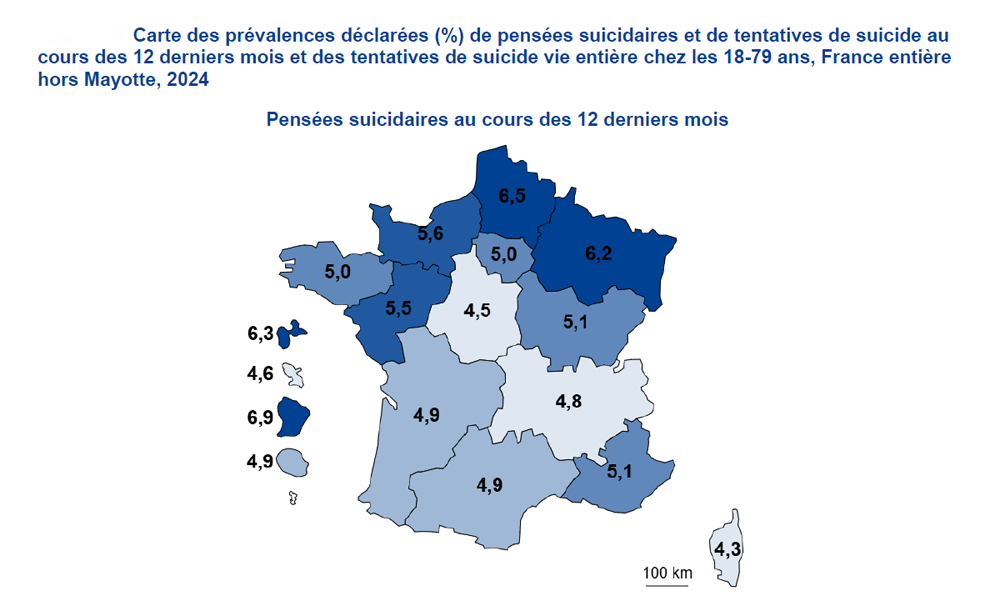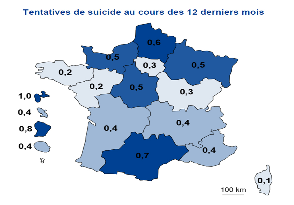 Guyane. Sur l’année 2024, 6,9% des adultes de 18 à 79 ans déclaraient avoir eu des pensées suicidaires au cours des 12 mois, ce qui met la région au premier rang de France dans cette catégorie, et 0,8% ont fait une tentative de suicide dans la même période. Selon SPF, « 208 passages aux urgences pour geste auto-infligé étaient recensés en Guyane, soit une part d’activité de 2,6‰ au sein des services d’urgence, en baisse par rapport à 2023 (- 29%) ». Sur ces passages, près de 2 sur 3 étaient des femmes (61%).