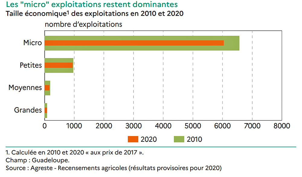 En Guadeloupe, les micro unités, qui sont majoritaires, occupent une surface agricole moyenne de trois hectares, et valorisent 54% de l’agriculture du territoire. Elles emploient aussi 54% de la main-d’œuvre agricole. « Elles sont surreprésentées dans les exploitations spécialisées en bovins viande, canne et polyculture-polyélevage », relève le ministère. Les petites unités (entre 25.000 et 100.000 euros de PBS (production brute standard, coefficient attribué aux cultures et aux cheptels, qui donne une valeur au potentiel de production des exploitations, ndlr) représentent quant à elles 13% des exploitations. Les grandes unités (plus de 250.000 euros de PBS) représentent 1% des exploitations et cultivent 14% des surfaces. Elles sont principalement spécialisées dans des cultures végétales (banane et maraîchage).