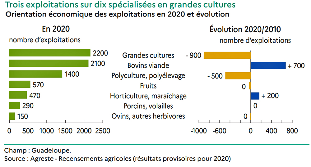 Le document du ministère de l’Agriculture note également que le nombre d’exploitations spécialisées en grandes cultures a baissé de 30% en 10 ans. « Cette baisse est occasionnée principalement par la disparition d’un nombre important de planteurs de canne qui cultivaient de petites surfaces (2 ha en moyenne) ». A l’inverse, le nombre d’exploitations spécialisées dans l’élevage bovin a augmenté de 700 unités (30%) sur la même période. « Cette hausse n’est pas le résultat du développement de l’élevage bovin en Guadeloupe, dont le cheptel est en baisse régulière. Elle provient principalement de la spécialisation en élevage d’exploitations qui associaient culture et élevage en 2010 », explique l’étude.