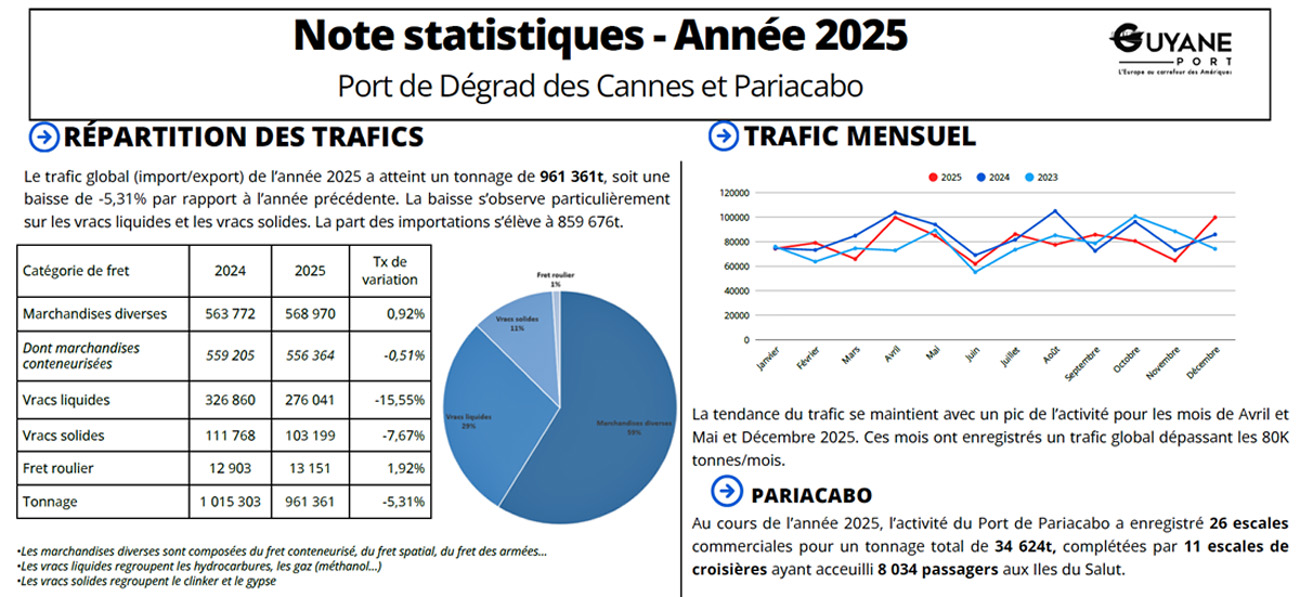 En 2025, le Grand port maritime (GPM) de la Guyane a enregistré une baisse de 5,31% de ses volumes, qui s’établissent à 961 361 tonnes. Malgré ce recul ponctuel, la tendance de fond reste positive sur la dernière décennie : depuis 2015, le trafic global est passé de 600 000 à 960 000 tonnes, soit une progression de 50%. La diminution observée en 2024 s’explique principalement par le repli des vracs. Les vracs liquides chutent ainsi de 15,5%, pour atteindre 276 041 tonnes, soit environ 50 000 tonnes de moins que l’année précédente, d’après une note du site Ports et corridors.