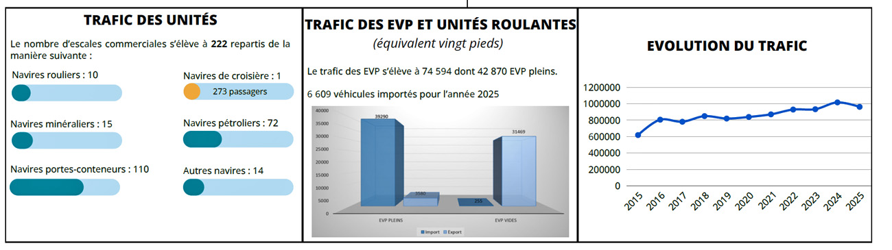 « Outre ces travaux, le GPM de la Guyane continue de travailler sur le poste roulier. La phase des travaux est prévue l’année prochaine pour la partie terrestre et en 2028 sur la partie maritime. En 2026, le port continue les études techniques. Le redimensionnement du poste roulier peut attendre. Le trafic enregistre une baisse de 6,4% à 6609 unités transbordées dans le port. En tonnage, le trafic progresse de 1,9% à 13 151 t en 2025 par rapport à 2024. Une croissance qui ne compense pas les pertes de volume enregistrées en 2024. Au cours des trois dernières années, le trafic roulier demeure sur un niveau moyen à 13 100 t », ajoute le document.