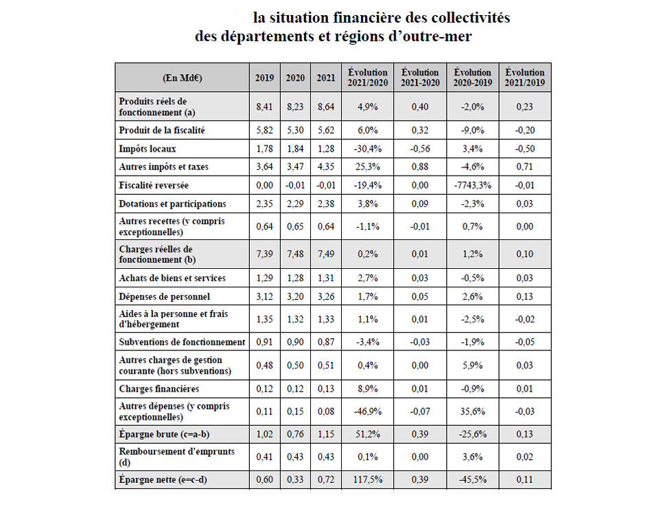 Dans son « Rapport sur la situation financière et la gestion des collectivités territoriales et de leurs établissements publics en 2021 », publié ce mois-ci, la Cour des comptes consacre un chapitre spécifique relatif à la situation financière des collectivités des départements et régions d’Outre-mer. Elle effectue deux constats. Premièrement, en 2021, les collectivités territoriales et les établissements publics de coopération intercommunale d’Outre-mer ont retrouvé leur solvabilité financière d’avant la crise. Deuxièmement, des situations demeurent dégradées, voire critiques, pour certaines collectivités.