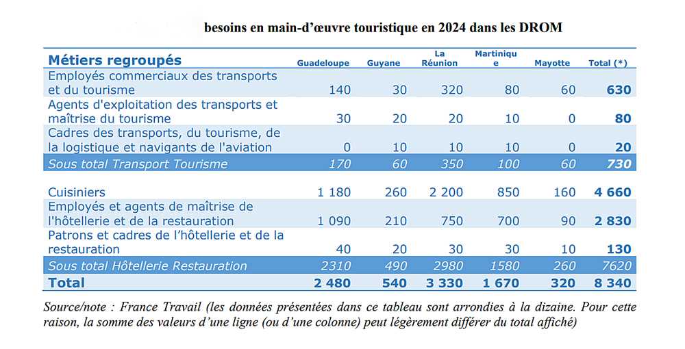 Ce paradoxe résulte de plusieurs facteurs, d’après le document : les métiers du tourisme souffrent d’un manque d’attractivité, en raison de salaires peu élevés, de conditions de travail difficiles et d’une image peu valorisante. S’y ajoute un déséquilibre entre les compétences disponibles et les attentes des employeurs. Le phénomène est accentué par le vieillissement démographique et le départ des jeunes vers d’autres régions. En outre, les collectivités ultramarines sont pénalisées par l’absence de données fiables sur l’emploi touristique, alors même que ce secteur représente un enjeu stratégique pour elles, tant sur le plan économique que pour l’identité et la mise en valeur de leurs territoires.