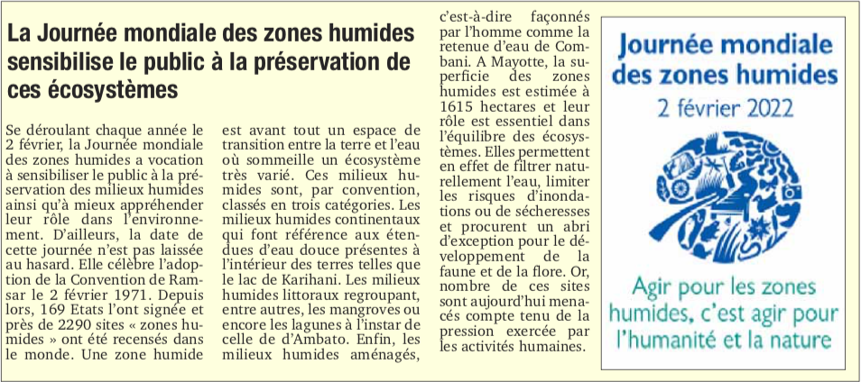 La Journée mondiale des zones humides 2022 du 2 février, inaugure un mois d’animation centrée autour de la thématique « Agir pour les zones humides, c’est agir pour l’humanité et la planète » ; l’occasion de revenir sur un danger bien présent : l’envasement du lagon. Explications de notre partenaire France Mayotte Matin.