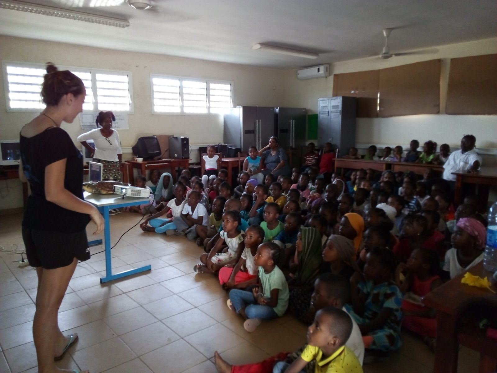 Au centre de la table, une tortue en résine. Synonyme du début de la séance. Première question : « Comment reconnaît-on la tortue verte et la tortue imbriquée ?», les deux espèces de tortues qui viennent se reproduire à Mayotte. Après une brève réflexion, les enfants ont la réponse. « La tortue verte a deux écailles entre les yeux et la tortue imbriquée quatre». Trop facile ! Mais pour la deuxième énigme, il va falloir se creuser davantage les méninges... « Pourquoi la tortue imbriquée a un bec crochu et la tortue verte un bec arrondi ?» , demande Hamidani Saindou. Après quelques tâtonnements, les écoliers décident de se lancer.