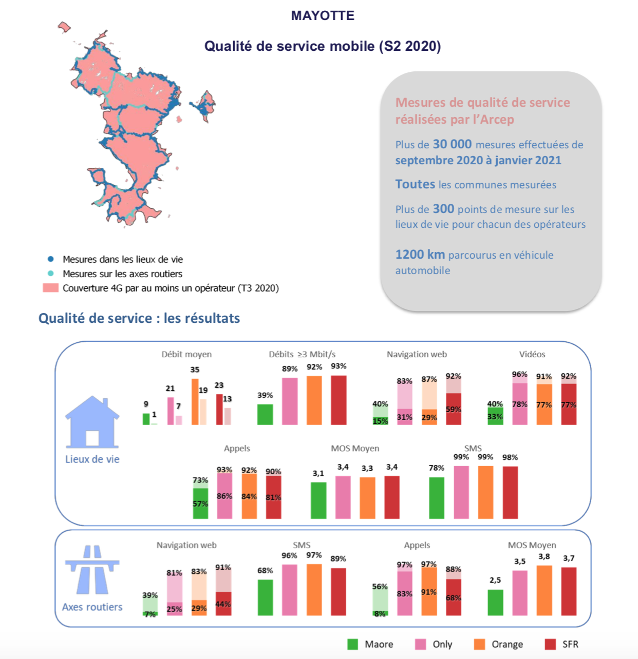 À Mayotte, SRR, Orange et Free se distinguent chacun sur des indicateurs différents : si SRR propose une meilleure expérience en navigation web, Orange offre une qualité de service en voie meilleure et des débits plus élevés. Free présente une qualité de service toujours élevée pour la voix et les SMS, et en nette progression en data ; il prend la première place sur certains indicateurs comme la qualité du streaming. La qualité de service de Maore Mobile reste encore en retrait (notamment en raison de sa couverture encore restreinte) mais progresse par rapport à l’année dernière.