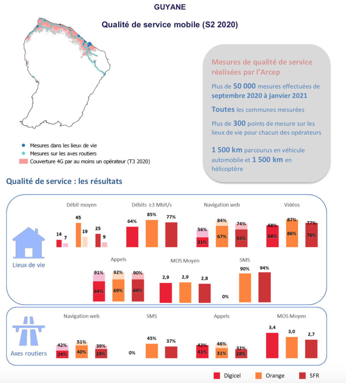 À La Réunion, on constate une qualité de service globalement élevée, en particulier en ce qui concerne la qualité des appels, où les résultats des opérateurs sont d’ailleurs assez proches. Sur l’ensemble des indicateurs, Orange et SFR sont au coude-à-coude, avec un léger avantage à Orange notamment en matière de débits. Pour ZEOP, les mesures passent de plus en plus par le réseau « en propre » que l’opérateur continue de déployer. Free quant à lui présente une qualité de service améliorée par rapport à l’année dernière et se trouve au coude-à-coude avec ZEOP.