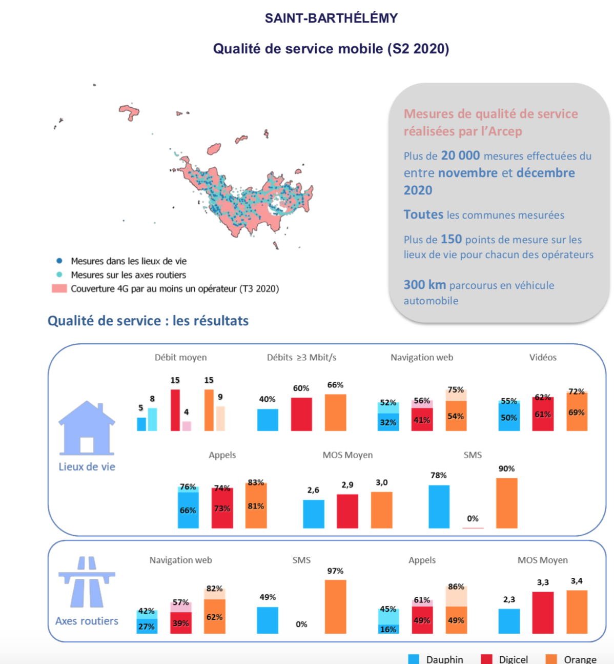 A Saint-Barthélemy, les performances ont peu évolué entre 2019 et 2020, pour l’ensemble des opérateurs. Plusieurs indicateurs présentent des résultats inférieurs à l’année dernière. Orange conserve ainsi son avance, suivi de Digicel puis de Dauphin Telecom.