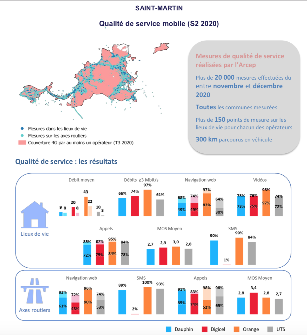 A Saint-Martin, Orange déjà en tête l’année dernière, est l’opérateur qui progresse le plus, que ce soit en data ou en voix. Concernant le service data, ce sont ensuite Digicel, puis Dauphin et UTS qui proposent les meilleures performances. Concernant le service voix, selon les indicateurs, Orange est suivi de Digicel, UTS ou Dauphin.