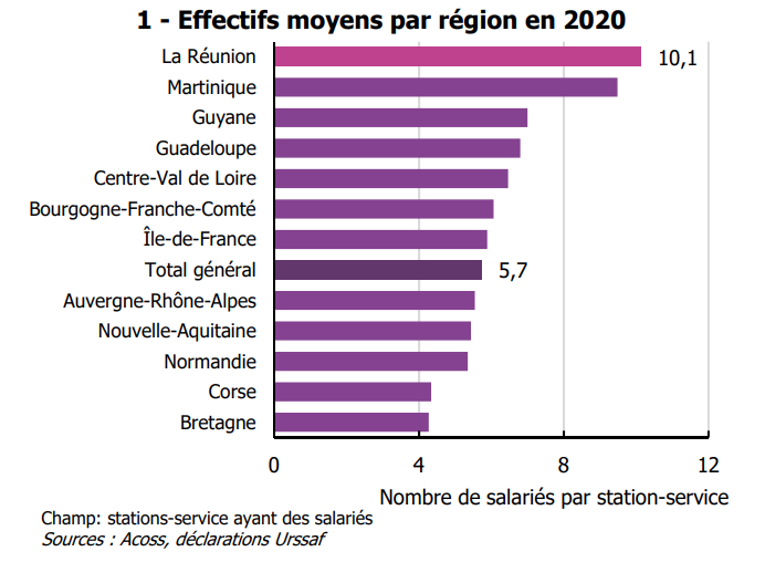 En 2020, quelque 1 300 salariés travaillent dans les stations-service de La Réunion, soit 6,4 % des salariés du secteur du commerce de détail. Ces stations-service comptent 10 salariés en moyenne par station, contre un peu moins de 6 salariés en moyenne en France entière. Les stations-service de Guyane et de Guadeloupe emploient environ 7 salariés en 2020, alors que celles de la Martinique affichent un effectif moyen de 9,5 salariés par station.